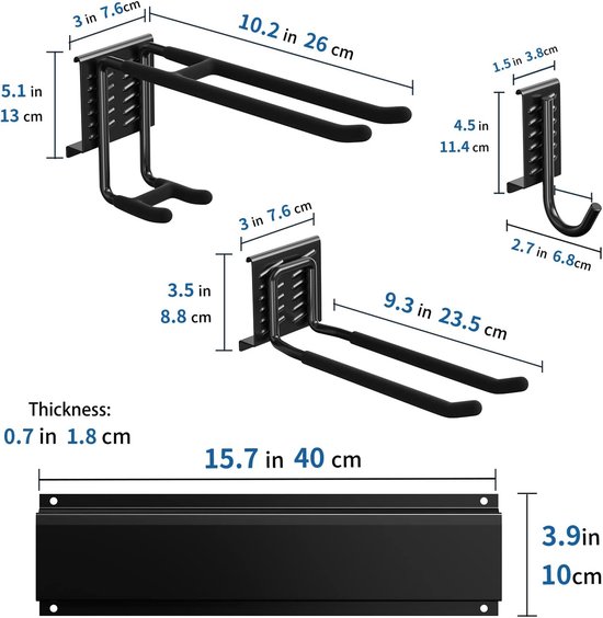 Détail : vis noires pour un look plus homogène. Organiseur Mural Robuste De 121,9 Cm Pour Garage, Support Mural Pour Mesurant 121,9 cm de large, il offre suffisamment d'espace pour accrocher des chaises de plage pliantes, des chariots de plage, des échelles, des balais de garage, des pelles, des râteaux, des houes, des débroussailleuses, des marteaux, des désherbeurs, des rouleaux de peinture à long manche, des poussettes, des cordons et des vélos, des outils de jardin, de cour, d'étang et de pelouse, et d'autres outils à long manche, les gardant bien rangés et facilement Accessible Fabriqué avec des matériaux en alliage d'acier durable, cet organisateur est conçu pour résister aux exigences d'un environnement de garage occupé. Nom : organisateur d'outils de jardin de garage. Organiseur Garage, Système de Rangement Réglable 64inch avec 20... Contenu de l'emballage : trois rails en acier de 40,6 cm, six crochets mobiles, trente vis métalliques et trente ancrages muraux Installation facile : livré avec tout le matériel nécessaire pour un montage mural rapide et facile, vous pouvez personnaliser séparément ou ensemble si nécessaire. L'organisateur D'outils De Garage Peut Supporter Jusqu'à 800 Lb, Avec Des Crochets Et Des Rails Réglables, Une Finition Sans Rayures Et Une Installation... Transformez sans effort votre garage encombré en un espace bien organisé et fonctionnel avec cette solution de rangement pratique et peu encombrante. Marque : PIYILO Couleur : noir. VEVOR Organisateur D'outils De Garage, Capacité De Charge Maximale Caractéristiques : Désencombrez votre garage et gardez vos outils organisés avec cet organisateur mural d'outils de jardin. Chaque rail est conçu pour s'adapter à l'espacement des goujons standard de 40,6 cm, parfait pour les garages, abris de jardin et ateliers nécessitant une organisation robuste Simplifiez-vous la vie et profitez d'un garage bien rangé et sans stress avec cet organisateur d'outils essentiel. Design peu encombrant : les crochets ont un joli revêtement doux qui protégera les outils et empêche tout bruit gênant lorsque vous placez des choses sur ou retirez des objets du support. Le porte-outils utilise l'espace mural inutilisé, aidant à garder le garage bien rangé et sans encombrement