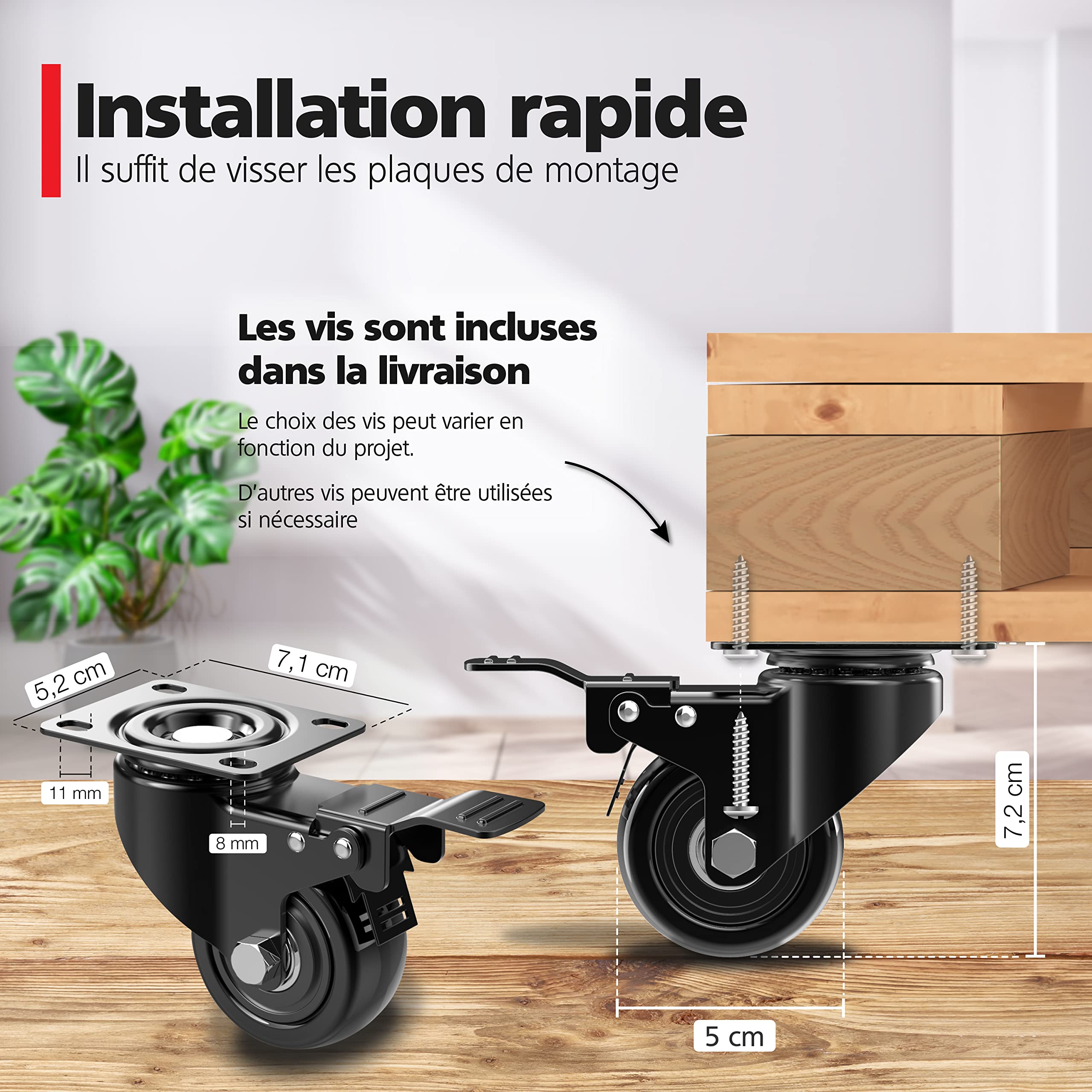 Kit complet de 4 roulettes avec frein : comprend 4 roues pivotantes pivotantes, chacune avec système de frein pour plus de stabilité et de sécurité sur les surfaces lisses. Installation facile : les roues sont équipées d'une plaque d'assemblage pour une installation rapide et simple sur n'importe quel meuble ou équipement. Roues pivotantes à 360° : garantit une maniabilité fluide et polyvalente, permettant de déplacer facilement le meuble dans n'importe quelle direction. Kit De 4 Roues Pour Meubles Avec Goupille Et Frein Diamètre 40 Mm Lot de 4 roulettes pivotante 100 mm avec freins capacité 500 kg. Chariot à pousser Karways Voss 4 roues avec poche isotherme et frein au... A2ZWORLD Kit de 4 roues pour meubles avec goupille et