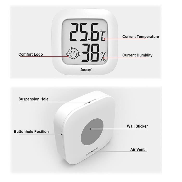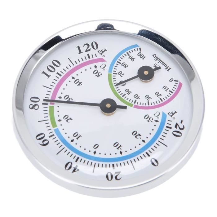 Caractéristiques : Ce thermomètre et hygromètre est un excellent moyen de mesurer le taux d'humidité et la température à l'intérieur. 【Fonction】 Ce thermomètre et hygromètre sont un excellent moyen de détecter la teneur en humidité et la température à l'intérieur. Caractéristiques techniques : Couleur : Or / Blanc Dimensions : diamètre : 58 mm, épaisseur : 13,5 mm. Température mini analogique hygromètre Forme Ronde thermomètre... Il mesure la température entre -30°C et 50°C avec une précision de ±2°C, et l'humidité de 0 à 100% avec ±5% de précision. Les grandes chiffres noirs sont... Thermomètre Et Hygromètre, Thermo-hygromètre, Thermomètre Et Cadran en alliage d'aluminium, plastique et PVC clair et facile à lire. Mini thermomètre intérieur Salle Hygromètre Capteur Thermomètre numérique intéri 【Installation facile】 Conçu avec des trous suspendus pour une suspension facile sur la surface du mur. Matériel: alliage d'aluminium + plastique + PVC Quantité : 1., Remarques : 1., En raison des différents effets de moniteur et de lumière, la couleur réelle de l'article peut être légèrement différente de la couleur montrée sur les images., Merci !, 2., Les mesures étant prises à la main, les tailles indiquées peuvent varier de 1 à 3 cm. Dimensions : diamètre : 58 mm, épaisseur : 13,5 mm.