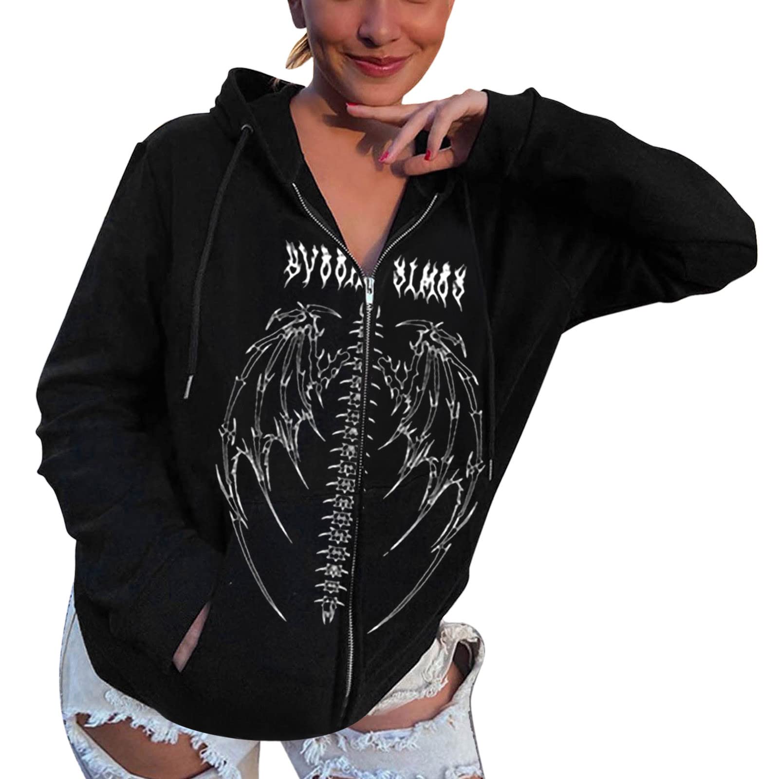 Sweat à capuche Y2k pour femme avec fermeture éclair - Haut Gothique - Imprimé lettre - Sweat-shirt esthétique à manches longues vintage punk Informations Pour femme., Matériau : polyester. Occasion : le sweat-shirt à capuche à manches longues avec fermeture éclair est adapté pour la vie quotidienne, les fêtes, le sport, les vacances, les clubs, le shopping, etc. T-shirt Sweat à capuche graphique Veste Bluza, Hooddy Sports, bluza Matériau : ce sweat-shirt est fabriqué en tissu de haute qualité. Doux et confortable à porter. Design Sweat à capuche Kawaii Harajuku parfait avec des jeans en denim, shorts, leggings, jupes gothiques, pantalons de survêtement, tous les vêtements que vous aimez. Sweat Zippé Femme Dark Future - T-shirt à Manches Longues Avec Imprimé Papillon Au Dos Gris Delave Sweat Zippé Capuche Femme Contenu de l'emballage : 1 sweat à capuche Y2k Caractéristiques : Avec capuche décorative en peluche, motif papillon abstrait, motif imprimé lettre, veste imprimée à manches longues, sweat-shirt à capuche pour femme, vêtements d'automne, jolies poches avant fonctionnelles pour transporter de petites choses lorsque vous sortez. Matériau : ce sweat à capuche imprimé graphique vintage est fabriqué en polyester, doux et confortable à porter, les sweats à capuche vous apporteront confort et mode. Achetez Sweat à capuche zippé imprimé graphique grunge, veste Emo, vêtements vintage, Harajuku, sweat-shirt baggy, Kawaii coréen, Indie, Y2K, Goth Mall sur...