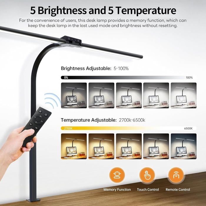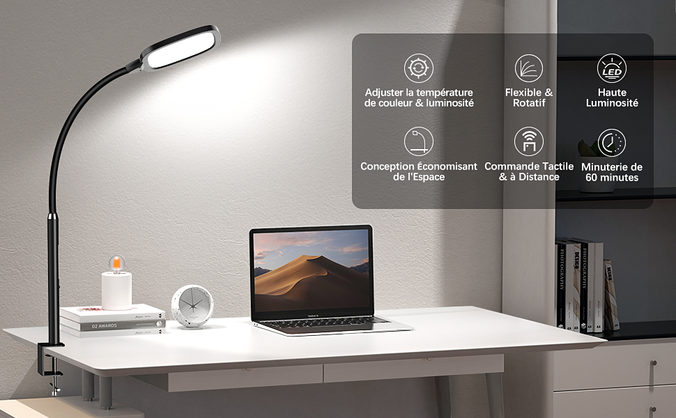 Il dispose également de quatre modes prédéfinis pour répondre à vos différents besoins d'éclairage. 【Lampe de Bureau Télécommandée et à Commande Tactile】: Avec cette lampe de bureau LED à intensité variable équipée d'une fonction de boutons tactiles sensibles et d'une télécommande, avec laquelle vous pouvez contrôler la lampe plus facilement. Lampe Bureau Led Lampe De Bureau Rechargeable, 5 Températures De Couleur, 5 Luminosités Lampe Led Il comprend 5 températures de couleur (2800K-6000K) × 5 niveaux de luminosité (10 %-100 %), 25 modes de combinaison de lumière peuvent être réalisés. pas de lumière bleue, pas d'éblouissement et la source de lumière douce protège vos yeux de la fatigue. Lampe de Bureau Enfant - Z4859 - 3 Températures de Couleur et 【Protection des yeux, économie d'énergie et lampe de bureau à col de cygne rotative à 360° 】: La lampe de bureau à col de cygne est fabriquée en gel de silicone souple et est rotative, de sorte que vous pouvez positionner la direction de la lumière librement. Liseuse tour de cou LED rechargeable, liseuse 4 LEDs avec 3... La pince métallique solide peut être facilement fixée au bord du bureau et convient aux plateaux de différentes épaisseurs (jusqu'à 5., 5 cm), économisant ainsi un espace précieux sur votre bureau 1 lampe de bureau (matériau : alliage d'aluminium, finition noire mate) ; 1xtélécommande ; 1x adaptateur GS (longueur : 180 cm) ; 1x manuel d'utilisation. Cette lampe de bureau de 75 cm de large permet un éclairage complet de l'ensemble de votre espace de travail. NICOLA Lampe de bureau, lampe de bureau LED dimmable, 5 températures de... Éclairez votre espace avec style grâce à cette lampe LED pivotable, écoénergétique et compacte. 【Col de Cygne Réglable et Gain de Place】: Le support en alliage d'aluminium haut et robuste combiné au col de cygne flexible vous offre un réglage flexible de la hauteur et plusieurs angles d'éclairage. 【Lampe de Bureau Super Lumineuse à Double Tête】 : La lampe de bureau LED a une conception à double tête, 112 puces LED intégrées respectueuses des yeux (56 blanc froid, 56 lumière chaude).
