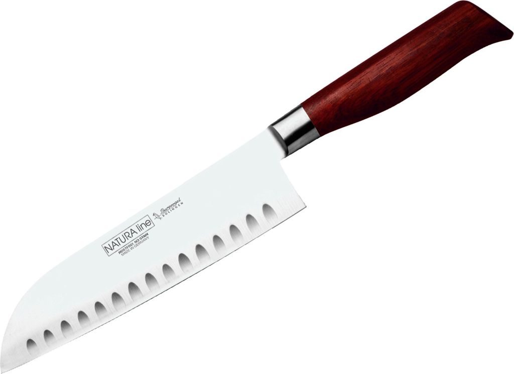 Les lames de maître de Burgvogel sont forgées d'une seule pièce. Couteau de chasse Mikra, manche olive satiné ⚔️ Boutique Épées Burgvogel est un fabricant de couteaux de Solingen, fondé en 1949. L'entreprise familiale s'appuie sur des technologies innovantes combinées à un savoir-faire artisanal traditionnel et garantit une qualité exceptionnelle - un rapport qualité-prix optimal. Vous aimerez peut-être aussi... Acier au chrome molybdène de haute qualité X 50 CrMoV 15 Avec une longueur de lame de 18 cm, les couteaux forgés ont été trempés jusqu'à 57 HRC. Il se distingue du couteau de chef allemand par la forme unique de sa lame et l'épaisseur plus fine de celle-ci. On utilise l'acier X50CrMoV15 (chrome-molybdène-vanadium), qui a fait ses preuves à Solingen. La poignée en bois tient parfaitement dans la main grâce à une ergonomie optimisée. Le traitement thermique spécial promet une qualité unique, un affûtage à la main pour un tranchant extrême et un polissage exceptionnel de la lame. La ligne Natura libère un caractère naturel grâce à l'utilisation de séquoias de première classe. Le couteau de cuisine traditionnel est utilisé pour le poisson, la viande et les légumes. We are a traditional company, domiciled in the city of blades Solingen since 1949. Our product range comprises knife series like MASTER line, COMFORT line and NATURA line | Karl Bahns GmbH Santoku Japonais Burgvogel SOLINGEN Couteau De Chef Natura Line, Manche En Bois, Rouge Satiné, Forgé, 15 Cm, Couteau De Cuisine Très Tranchant Inoxydable, Made In Germany Couteau Solingen La combinaison de l'innovation et de l'artisanat donne des résultats exceptionnels, qui sont reconnus dans le monde entier - Me Fecit Solingen (Solingen m'a conçu).