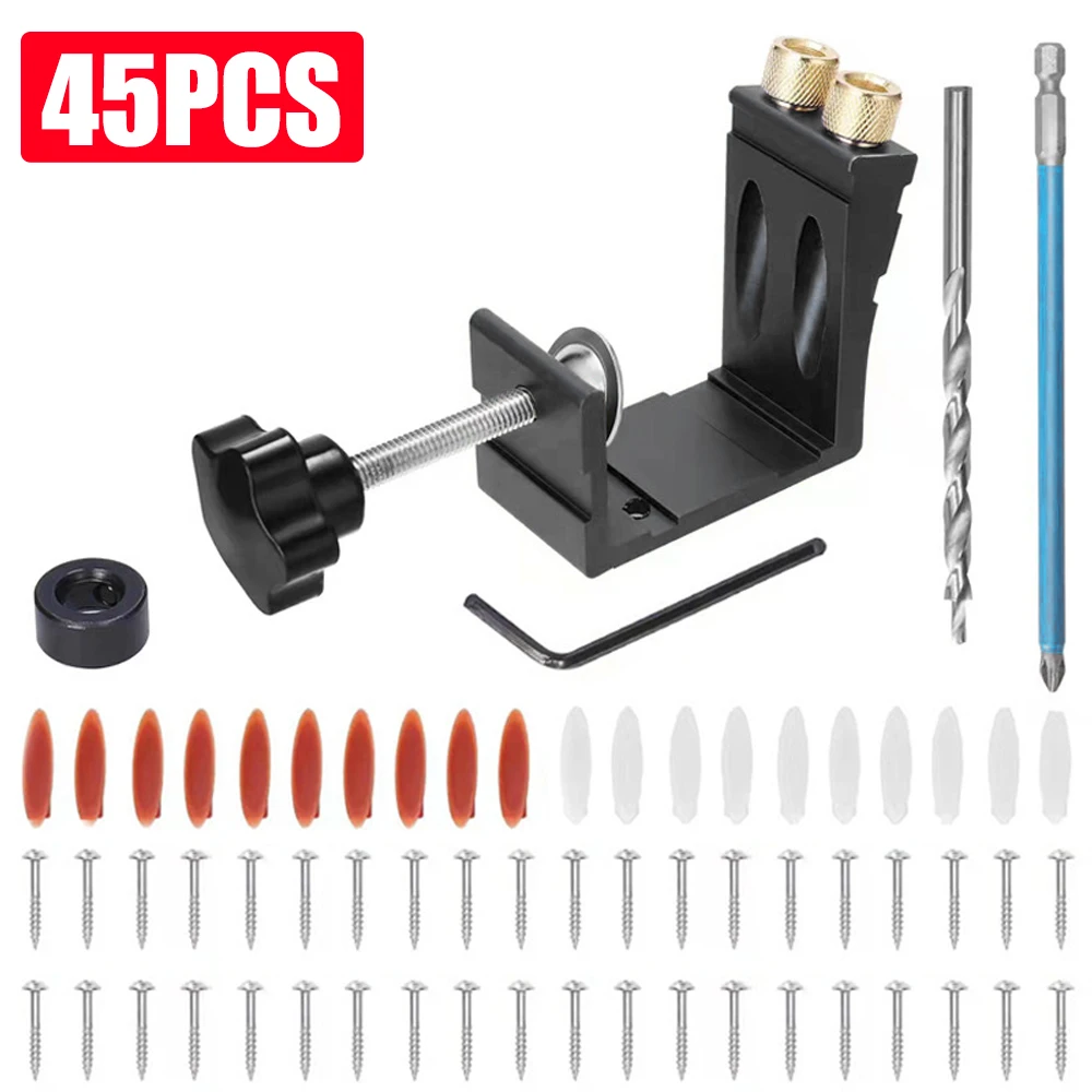 Si la poignée ne peut pas être pressée vers le bas, desserrez les pinces orange de l'autre côté ; si la poignée est trop lâche, serrez les pinces orange pour l'opération de serrage., 6., Montez la perceuse sur la perceuse électrique et percez les trous en séquence. Gabarit Trou De Poche Extérieur Kit De Gabarit De Poche, Gabarit De Travail Du Bois à 15 Degrés Avec Gabarit De Cheville Pour Bois 👍Matériau très résistant Le gabarit de poche est fabriqué en acier inoxydable de haute qualité et en cuivre, et il dispose d'un foret étagé plaqué titane qui durera longtemps. KIT DE GABARIT de Trou de Poche pour le Travail Du Bois, Localisateur... Ce gabarit à vis de poche nouvellement amélioré intègre des pinces et des échelles, et il intègre deux supports déployables de chaque côté, qui servent de meilleur maintien pour les planches particulièrement larges. Si vous avez un rêve d'ingénieur dans votre cœur, construisez votre propre placard, table basse, étagère et autres meubles vous donnera plus de bonheur. 2 butées de perçage., 10 bouchons de poche. Contenu du kit de gabarit de poche : 1 gabarit de poche., 2 forets 3/8. Le foret de poche a une forte résistance à l'usure, la lame est tranchante, le perçage est lisse, la durée de vie est plus longue. Les kits de gabarit de poche sont parfaits pour les novices, les amateurs et les professionnels. 👍Méthode d'utilisation : Mesurez l'épaisseur de la planche sur la base du gabarit de trou de poche., 2., Desserrez le curseur du trou de poche, soulevez le curseur à la position correspondante en fonction de l'épaisseur de la planche, puis verrouillez le curseur., 3., Placez le foret dans le trou, touchez le fond et soulevez-le jusqu'à 1 mm, puis verrouillez la butée de profondeur de forage. Coupe en douceur] La fixation est lisse, le foret est incisif, et il n'y a pas de bavure après la coupe et ne fait pas mal aux mains. [Retrait rapide des copeaux] Avec un port de retrait de copeaux indépendant, peut éliminer efficacement la sciure et empêcher le foret de se coincer Avantages : notre gabarit de poche est adapté pour les planches en bois de différentes épaisseurs, vous pouvez rapidement régler la hauteur du curseur en fonction de l'épaisseur de la planche, ne nécessite pas de mesures complexes ou d'opérations mathématiques. Assurance qualité : le kit contient 1 gabarit de poche, 2 forets, 2 colliers d'arrêt, 1 tournevis hexagonal, 1 sac de vis de poche et bouchons. Achetez maintenant chez VEVOR. Durable et précis : le système de trou de poche jig est fabriqué en acier rapide de haute qualité, qui ne rouille pas et ne se fissure pas. Il est plus pratique et plus rapide à utiliser, mais les gabarits ordinaires, les planches de fixation doivent être travaillées des deux côtés de la planche en bois. L'utilisation de cette pince vous aidera à percer des trous de poche parfaits dans le bois dur, le bois tendre et les planches à chaque fois, ce qui peut être utilisé pour la fabrication de nouveaux meubles. Kit de gabarit de goujons pour le travail du bois avec 3 pièces forets
