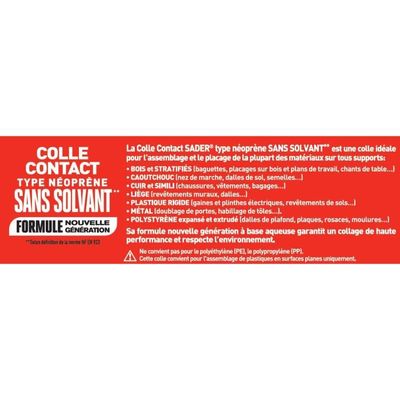 produit 1: Convient aux bois et stratifiés, caoutchouc, cuir (semelles pour chaussures…) et simili, liège, plastique et PVC rigide et métal. produit 1: Fabriquée en France comme près de 95% des produits Sader commercialisés dans l’Hexagone, Émission dans l'air intérieur : certifié A+ pour une maison saine Consommation : 150ml/m² sur chaque face selon les supports. Cette colle instantanée résiste à l'eau et à la chaleur, ce qui en fait une colle fiable pour tous vos besoins. Elle fonctionne sur une grande variété de matériaux – bois, caoutchouc, porcelaine, cuir et plus – elle fonctionne même comme colle pour le plastique*. * Facile à utiliser : bouchon anti-séchage et auto-perçant Résistante à l'eau, au lave-vaisselle, aux chocs et aux températures fortes Technologie : formule liquide à base de cyanoacrylate Couleur : transparent Format : 2 tubes de 3 g *Ne convient pas pour le polyéthylène (PE), le polypropylène (PP), le verre automobile, le styropor et les fibres synthétiques., Dangereux. Résistance maximale obtenue en 24 heures Idéal pour fixations de plinthes, lambris, tasseaux, moulures, poutres, carrelage... Maintien immédiat extra fort Sa formule gel est particulièrement adaptée aux utilisations sur surfaces verticales et sur supports très absorbants (béton, plâtre, panneaux à particules, feutre., ., ., ). Pressez immédiatement les deux surfaces ensemble et maintenez-les en place jusqu'à ce que la colle durcisse., C'est fini ! Sader Colle Contact Néoprène Liquide – Colle Extra Forte Tous atériaux... Loctite Super Glue-3 Original, colle forte et résistante de haute qualité, colle liquide tous matériaux, colle transparente à séchage rapide, 2 tubes 3 gRéparez, collez et faites des économies avec la colle pratique & polyvalente Loctite Super Glue-3 Original ! Colle contact néoprène en gel, spatule incluse - 500ml - Brico Dépôt Sader Colle Contact Néoprène Gel – Colle Extra Forte Tous Matériaux – Prise Immédiate – Idéale pour Supports Poreux ou Verticaux – Transparente – Tube 125 ml, AmbréLa colle contact SADER NEOPRÈNE GEL est une colle idéale pour l'assemblage et le placage de la plupart des matériaux sur tous supports en intérieur et extérieur sous abri. Transparente au séchage et instantanément résistante, cette colle Loctite Super Glue-3 Original assure des réparations durables et invisibles. produit 2: Tube pratique – Cette colle résistante dispose d'un bouchon anti-séchage afin que vous puissiez la réutiliser lors de vos divers projets de réparations ou collages. Formule gel qui ne coule pas, particulièrement adaptée aux utilisations sur surfaces verticales et sur supports très absorbants (béton, plâtre, panneaux à particules, feutre., ., ., ) produit 2: Colle instantanée – Cette colle universelle permet un collage puissant, transparent au séchage & durable avec une goutte seulement, en quelques secondes. Vous obtenez un collage puissant et instantané à l'aide d'une seule goutte. produit 1: Haute résistance à l'arrachement, aux hautes températures (jusqu'à +110°C) et à l’humidité. Lot 2 tube colle repositionnable gel super glue 3 LOCTITE réparation courante Colle Forte Tout Support Colle Contact Néoprène Gel 55ml SADER : Le Tube De 55mL à Prix Colle Contact Neoprene Gel produit 1: Colle néoprène super-puissante à prise immédiate et définitive pour l’assemblage et le placage de la plupart des matériaux sur tous supports en intérieur et extérieur sous abri Elle offre une prise immédiate et définitive sur les matériaux suivants : BOIS et STRATIFIES : baguettes, placages sur bois et plans de travail, chants de table., ., ., CAOUTCHOUC : nez de marche, dalles de sol, semelles., ., ., CUIR et SIMILI : chaussures, vêtements, bagages., ., ., LIÈGE : revêtements muraux, dalles., ., ., PLASTIQUE RIGIDE : gaines et plinthes électriques, revêtements de sols., ., ., MÉTAL : doublage de portes, habillage de tôles., ., ., Elle ne convient toutefois pas pour le polyéthylène (PE), le polypropylène (PP) et le polystyrène expansé ou extrudé.