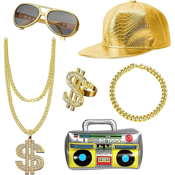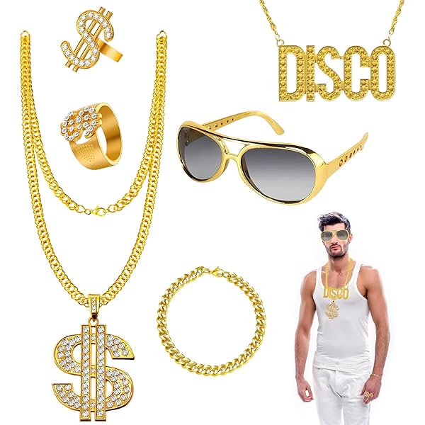 Le collier et la bague hip-hop sont fabriqués en métal de haute qualité, stables, robustes et durables. Hip Hop Collier Cubique Zircon Mbm Lettre Pendentif Glacé Plein Diamant Pendentif Chaîne _Or Design de fête des années 80/90 : le kit de constume hip hop est conçu avec un signe dollar spécial et adopte un style de mode rétro classique. Vous ressemblez à un homme milliardaire avec ces accessoires de costume Joker Costume Ensemble Chaîne Dollar, Costume Hip Hop, Accessoires De Costume Hip-hop, Collier, Bague, Lunettes De Soleil, Chaîne Dorée, Bijoux Pour Homme Années 80/90, Carnaval, Fête Annee 90 2000 Parfait pour les stars du rap, les artistes hip-hop et les fans de mode hip-hop. Il comprend un collier pendentif en forme de dollar, une bague en forme de dollar, un bracelet en chaîne dorée et une paire de lunettes de soleil. Fabriqué avec... Le collier en dollars mesure 6,5 cm / 2,55 pouces de large et 70 cm / 27,55 pouces de long. Les lunettes de soleil à motifs léopards sont à la mode pour les hommes et les femmes. Vous pouvez ajuster le fermoir à n'importe quel endroit de la chaîne pour obtenir la taille souhaitée. Matériau : les colliers et les bagues sont en alliage, robustes, solides et difficiles à décolorer, leur éclat brillant et leur bel aspect en font d'excellen