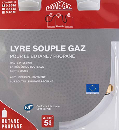 La lyre doit être changée à la date de péremption figurant sur le tuyau Lyre souple butane/propane L.70 Gurtner - Facile à installer et flexible - Plomberie et... Flexible gaz - Eurogaz - 1 m - Inox - 15 x 21 - Embouts mécaniques - Bricolage Entrée écrou bouteille., Sortie écrou 20 x 150., A clé coulissante., NF M 88-768., Marque : EurogazRéférence fournisseur : 504., 1003 L 35Type de produit : Lyre souple butane / propaneCertifications et normes : NF M 88-768Certifications et normes : NFUtilisation : Robinetterie gazType de gaz : Butane, PropanePression : Pression max : 20 barLongueur : 0,35 m Lyre élastomère Butane Lyre élastomère Pour Butane Et Propane - Validité 5 Ans - Longueur 0,35 M - P11 Lyre Gaz La lyre est un petit tuyau de gaz dont la longueur varie entre 35, 45, 70 et 75 cm. Elle est dotée d’embouts femelles à visser d’une dimension de 20 x 150 cm. Les lyres conviennent aussi bien pour le gaz propane que le butane, à condition que la pression maximum d’utilisation d’excède pas les 20 bars Lyre souple butane / propane Eurogaz - Longueur 0,35 mLa lyre doit être changée à la date de péremption figurant sur le tuyau. La pression maxi d'utilisation 20 bar.