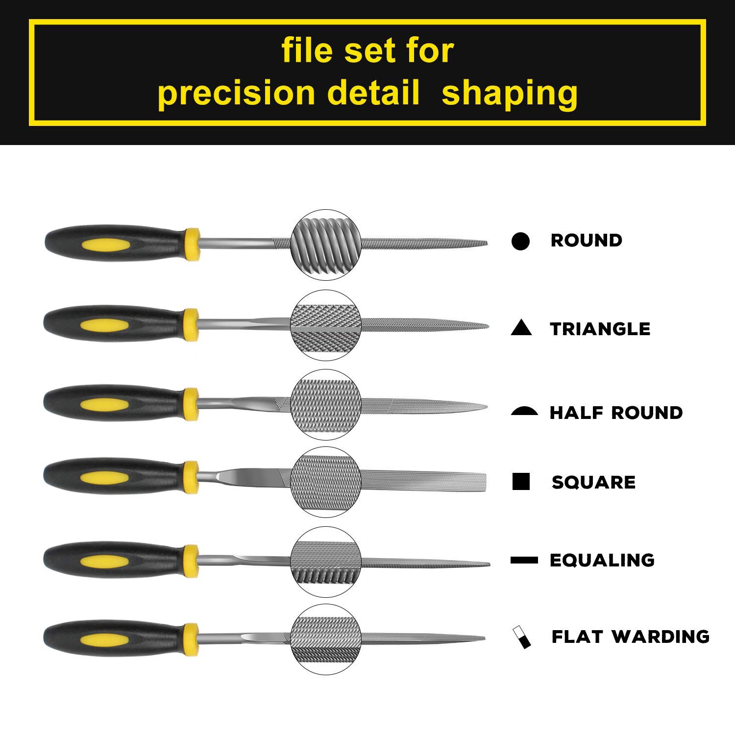 Le lot de 6 limes aiguilles est conçu pour les tâches de limage de précision, idéal pour le travail du métal, le travail du bois et le modélisme. Le lot est livré dans un double blister, ce qui garantit que les fichiers sont stockés en toute sécurité et facilement accessibles. Ce lot comprend six limes à aiguilles différentes, chacune avec une forme unique pour répondre à différents besoins de limage. Idéal pour limer des matériaux comme le titane ou l'inox, meilleure résistance à l'usure sur le platine, pour la bakélite, nylo, araldite etc. Les limes aiguilles Vallorbe fines avec bords et pointes taillées, facilitent les travaux fins et de précision Ensemble de limes à aiguilles Premium – Limes en acier à haute teneur en carbone avec poignées ergonomiques antidérapantes pour un classement précis sur le... Lime Tronconneuse Lot De 6 Limes Métalliques En Acier Au Carbone 4 X 160 Mm Pour Travail Du Métal Et Du Bois Rape A Bois Fabriqué en acier durable à haute teneur en carbone, ce lot comprend six formes de limes différentes, chacune avec une poignée en plastique confortable pour un meilleur contrôle et une réduction de la fatigue de la main. Mini limes à aiguilles diamantées et 5 petites limes en acier pour Cet emballage le rend également pratique pour l'affichage et la vente au détail. Les formes comprennent généralement des fichiers plats, ronds, demi-ronds, carrés, trois carrés et égaux, ce qui permet une utilisation polyvalente dans différents projets. Idéales pour les travaux de précision, ces limes sont adaptées pour la mise en forme, le lissage et la finition de matériaux tels que le bois, le métal et le plastique.