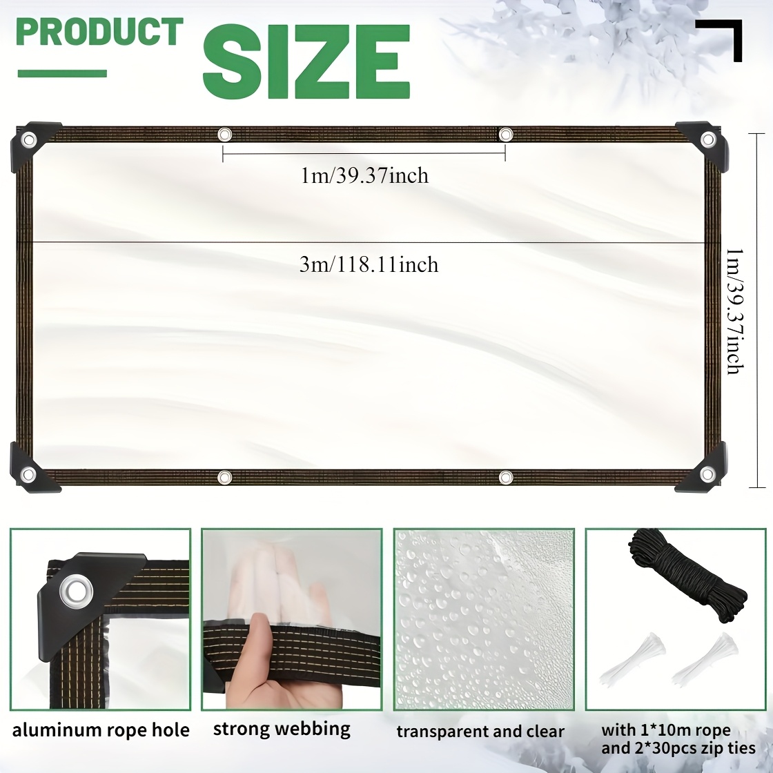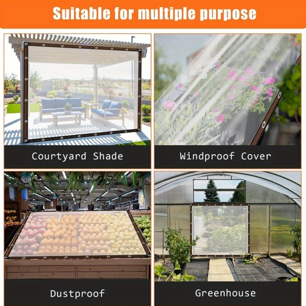 Protégez votre surface et vos objets contre les dommages avec cette bâche de protection. Taille : longueur x largeur (description de la taille : la taille que nous fournissons est la taille vierge, la taille réelle du produit est plus petite que la taille achetée, ce qui est normal, car il nécessite des boucles, des reliures, des surjeteuses et des coutures thermofusibles)., Remarque : 1., La taille finale du produit est légèrement plus petite que la taille de coupe indiquée, donc l'erreur est de 1 à 5 cm. La distance entre les boutonnières est d'environ 50 cm. Bâche transparente très résistante et imperméable : matériau épais, bordure double couche thermoscellée à haute température, ferme, résistante aux déchirures, durable. Si vous avez des questions, veuillez nous contacter à temps, nous résoudrons vos problèmes dans les 24 heures. La bâche est fabriquée en verre souple de qualité supérieure et utilise la dernière technologie pour résister à toutes les conditions météorologiques. Bâche imperméable et résistante en vinyle transparent avec œillets, coupe-vent et indéchirable, parfaite pour les patios et l'extérieur, installation facile... Bâche transparente. Pour l'intérieur et l'extérieur, la forte lumière du soleil, le vent, le gel et la grêle n'affecteront pas les performances du matériau. Bâche transparente : perforations métalliques fabriquées en alliage d'aluminium de haute qualité, coutures de bord en fibre de polyester, coins avec manchons triangulaires en caoutchouc, bords renforcés, solides et durables, et peuvent rapidement et facilement fixer la bâche. Comment une bâche transparente améliore la protection et la visibilité dans divers environnements - TONGYUAN Convient pour toutes les saisons. Bâche Plastique Avec Oeillets Bâche Transparente En Pvc Avec œillets, Imperméable Et Résistante Bâche Transparent Pour Jambes Transparence : 99,99 % - Indice d'étanchéité : 100 % - Épaisseur : environ 0,38 mm - Poids : 500 g/m². Très résistant à la chaleur, aux déchirures, à l'eau, au soleil, aux intempéries, etc. La corde est cousue sur les quatre côtés pour une fixation facile ; haute transmission de la lumière et forte isolation thermique. Les quatre coins sont renforcés avec des manchons triangulaires en caoutchouc, empêchant les déchirures et offrant une meilleure protection. Idéale pour une utilisation en extérieur, cette bâche offre une couverture fiable et une longévité pour diverses applications Les bords sont gaufrés pour une installation facile.