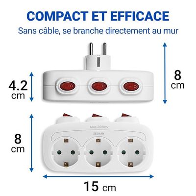 Adaptateur Multiprise Haute Puissance ZELKAN Compact, Résistant et Fonctionnel. Multiprise Murale Zelkan - 3 Prises + Interrupteurs Indépendants, Blanc Chaque prise comprend une porte de protection de sécurité indépendante qui permet d'empêcher efficacement l'insertion des doigts des enfants ou des objets... Idéal à la maison comme au bureau. 3 INTERRUPTEURS : Équipée d’un interrupteur individuel pour chaque prise, cette multi prise vous permet de contrôler totalement la consommation de vos appareils. Optimisez l’efficacité de vos connexions avec cet adaptateur multiprise haute puissance, idéal pour la maison, le bureau ou tout autre espace nécessitant le branchement de plusieurs appareils en toute sécurité et avec confort., 3 prises , 3 interrupteurs , Disposition horizontale , Puissance de 3680 W , Sans câble De plus, cette multiprise à 3 sorties est compatible avec les fiches européennes de type C, E et F. PRISES EUROPÉENNES : Cet adaptateur à 3 prises est compatible avec les prises européennes de type C, E et F. 3 INTERRUPTEURS INDÉPENDANTS Équipé de 3 interrupteurs, un pour chaque prise, vous permettant d’éteindre facilement les appareils inutilisés, réduisant ainsi la consommation d’énergie et maximisant les économies. DISPOSITION HORIZONTALE : Design compact de 15x8x8 cm, parfait pour des prises individuelles. HAUTE PUISSANCE : Cette triplette electrique supporte jusqu¿à 3680W, 16A et 250V, idéale pour connecter plusieurs appareils à forte consommation sans souci Prise Multiple Avec Interrupteur Individuel Multiprise Murale 4 Prises Zelkan Multiprise Murale 3 Prises - Interrupteurs Indépendants - 3680W - Blanc Prise Multiple Interrupteurs Prise Plate SANS CÂBLES : Cet triplite se branche directement à la prise murale, évitant ainsi les désagréments liés aux câbles.