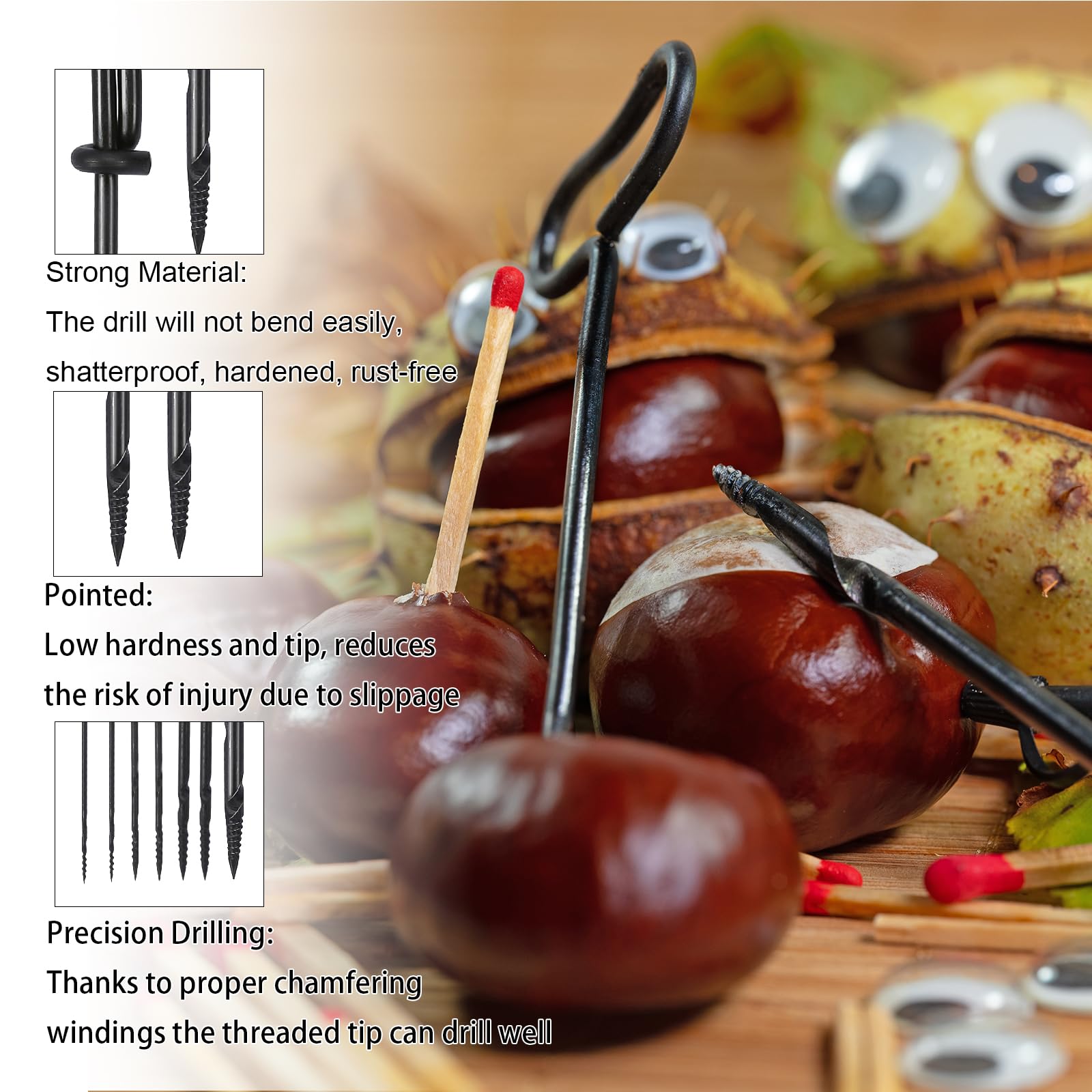 Kit de bricolage pour enfants Activité de bricolage intéressante : l'automne est le moment où les châtaignes sont mûres. Robuste et stable : nos forets à châtaignes fabriqués en alliage métallique spécialement durci sont stables, tranchants, inoxydables et polyvalents. Couronne Automne Enfant JOYEASE Lot De Forets à Châtaignier Pour Enfants, Avec Support Pour Activités Automne Enfant Money Back Guarantee ensures that buyers receive the item they ordered or get their money back. Contenu de l'emballage : vous recevrez 1 support de châtaignier en bois de hêtre naturel. 5 forets à main de différentes tailles (1,5 mm, 2 mm, 3 mm, 4 mm et 5 mm), 30 cure-pipes, 30 ressorts, 40 pompons colorés, 10 feuilles de papier coloré, 50 yeux mobiles autocollants, 30 yeux mobiles avec cils peints, 150 cure-dents Environ 30 g de... Contenu de l'emballage : vous recevrez 5 forets à main de différentes tailles (1,5 mm, 2 mm, 3 mm, 4 mm et 5 mm), 50 cure-pipes, 50 plumes, 70 pompons colorés, 50 yeux mobiles autocollants, 30 yeux mobiles avec cils peints et 250 bâtonnets en bois - un plaisir créatif pour toute la famille. Séparateur à Châtaignes MULOT Avec la multitude d'accessoires de bricolage, les enfants peuvent laisser libre cours à leur imagination et à leur créativité et créer de superbes figurines naturelles comme décoration d'automne Attention : les enfants doivent être assistés lors de l'utilisation par des adultes. Kit de bricolage sur les châtaignes avec des cure-pipes, de la feutrine colorée, des pompons, des plumes, des yeux mobiles et des mèches de châtaigne