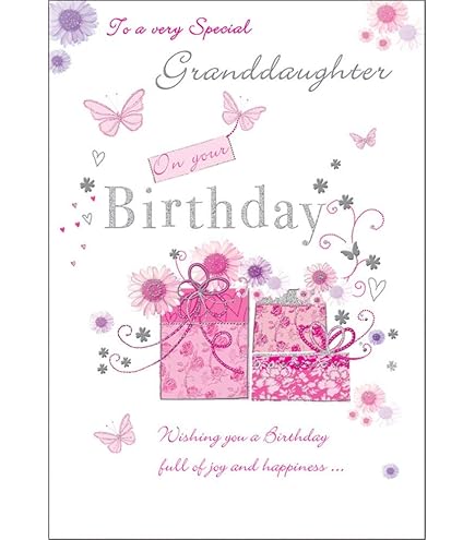 Carte de félicitations pour la naissance de votre petite-fille, lapin mignon, ballons et cadeaux Feuille colorée avec message (voir image) , Enveloppe blanche Cherry Orchard Granddaughter Birthday Card - To A Lovely Granddaugther On Your Birthday - Artistic Lady In Gorgeous Blue Floral Dress - Flitter & Gold Foil Finish - For Her Carte Félicitations Bapteme Fille À VENDRE! - FR Carte de vœux de qualité de Cherry Orchard conçue et imprimée au Royaume-Uni. Dimensions : 143 x 210 mm. Livrée avec enveloppe. Cette carte nécessite un tampon standard à l'intérieur du message