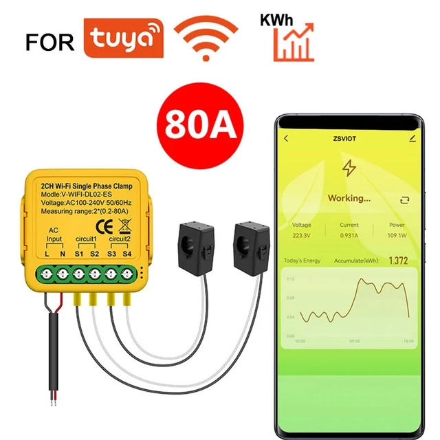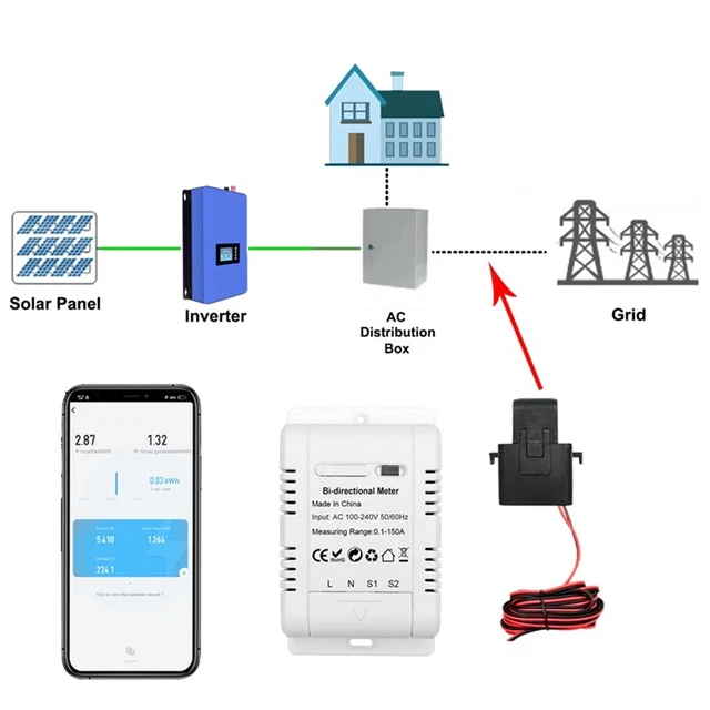 Automatisez votre maison : avec nos moniteurs d'énergie intelligents, vous pouvez facilement automatiser vos appareils et appareils ménagers. Caractéristiques : * Dans l'application, il peut afficher : Élec. Ce module est non-intrusif et bidirectionnel, donc intéressant dans le cas d’utilisation avec des panneaux solaires, il peut mesurer les énergies consommées et aussi injectées dans le réseau. Il faut tout d’abord intégrer le module avec l’application Tuya Smart et verifier que tout est opérationnel (KWh) Courant Ele(mA), Puissance actuelle (W), Tension actuelle (V), Total Ele(KWh) Caractéristiques techniques : Tension nominale : 100-240 V CA 50/60 Hz. Fréquence WiFi : 2,4 GHz. C'est aussi simple et sûr. Plage de courant mesurable : 0,2 A-80 A. Tuya Smart Bluetooth RBG CCT Projecteur Solaire Intelligent Extérieur Installation sûre et facile : nos moniteurs d'énergie ne nécessitent aucun changement de connexion filaire lors de l'installation. Il suffit de déposer les fils dans les clips et de commencer à mesurer. Affichage en temps réel de la consommation d'énergie horaire, quotidienne, mensuelle et annuelle (en kilowatt-heure), vous pouvez facilement suivre la consommation d'électricité et les coûts de votre maison. Tuya WiFi 3P4W Compteur Photovoltaïque Interrupteur De Réenclenchement TUYA WIFI BIDIRECTIONNEL Énergie Mètre Simple Phase 80A Kwh... Créez une scène où l'appareil fonctionne avec d'autres appareils TUYA – lorsque la puissance ou le courant de l'appareil dépasse une certaine valeur, d'autres appareils TUYA commenceront à fonctionner. Contenu de l'emballage : 1 compteur d'électricité., 2 x CT
