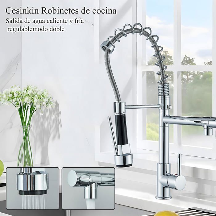 【 3 modes de jet polyvalents 】 Notre robinet d'évier de cuisine est équipé de trois modes de débit : pluie douce, jet à colonne avec aérateur et jet à lame. Chaque unité est soumise à des tests de pression de l'eau avant l'expédition, les gouttes à la première ouverture sont tout à fait normales. Verona Extensible avec douchette à Vaisselle,Robinet de Cuisine avec 2 3 modes d'options d'économie d'eau -- 2 boutons, 3 modes. La tête de pulvérisation du robinet peut être réglée sur 3 modes de débit d'eau différents : jet, jet... Matériaux de haute qualité : notre mitigeur de cuisine avec douchette amovible est fabriqué en acier inoxydable de haute qualité, avec une cartouche en céramique anti-perte et un tube PEX durable, offrant des performances stables et une longue durée de vie. Robinet Cuisine Avec Douchette Extractible JULLYBATHEVY Robinet De Cuisine - Mitigeur Monocommande Evier - Rotation à 360 °- 2 Modes -Chromé - Bricolage Robinet Cuisine Mitigeur évier Vous permet d'atteindre facilement chaque coin de l'évier, vous offrant une expérience de nettoyage complète et sans effort. La douchette s'étend facilement et rentre automatiquement après utilisation. Contrôle à une main : notre mitigeur évier de cuisine avec design à levier unique permet de régler la température et le débit d'une main. Et le pommeau de douche amovible en plastique ABS, facile à utiliser.♥PEUT ÊTRE TOURNÉ À 360° Le robinet de cuisine peut être facilement pivoté à 360 degrés, de sorte que lors de l'installation, vous pouvez positionner le levier du mélangeur vers la gauche ou la droite selon vos habitudes.♥400MM EXTENSIBLE Robinet peut être tiré...