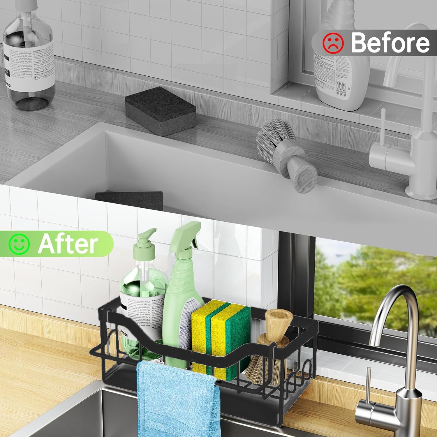 Petit organisateur très pratique pour y ranger éponge, chiffon et produit vaisselle sans encombrer le lavabo. Pas besoin de percer pour le fixer. Le plastique... Son support adhésif puissant garantit qu'il reste bien en place sans risque de chute. Fixez la carte adhésive au dos du produit, puis décollez le film protecteur. Organiseur d'évier de Cuisine Porte-éponge Rangement Eponge Cuisine Porte Eponge Pour Evier Organisateur D'évier De Cuisine, Rangement Evier Cuisine Avec Plateau De Drainage, Rangement Rangement Eponge Cuisine 【Trous de drainage pour une évacuation efficace de leau】Équipé de trous de drainage stratégiquement placés, notre organisateur dévier assure une évacuation rapide et efficace de leau, en la gardant au sec et sans moisissure. 【Plateau dégouttage amovible pour un entretien facile】Le bac dégouttage amovible permet déliminer leau sans effort, gardant votre plan de travail sec et propre avec un minimum deffort. 【Roulement de charge robuste et fiable】Avec une capacité de charge maximale de 2,5 kg, notre organisateur dévier offre un support stable pour vos essentiels de cuisine, garantissant quils restent bien en place. Gardez votre cuisine bien rangée et organisée sans effort avec notre organisateur d'évier – égouttoir à linge de cuisine. Laissez le produit reposer pendant 24 heures avant de placer des objets dessus. Eachpt Silicone Porte Eponge Evier Cuisine 2 Pièces 23 X 9 Eponges Fond... Instructions d'installation:Nettoyez soigneusement la surface de montage et assurez-vous qu'elle est sèche avant de l'appliquer.