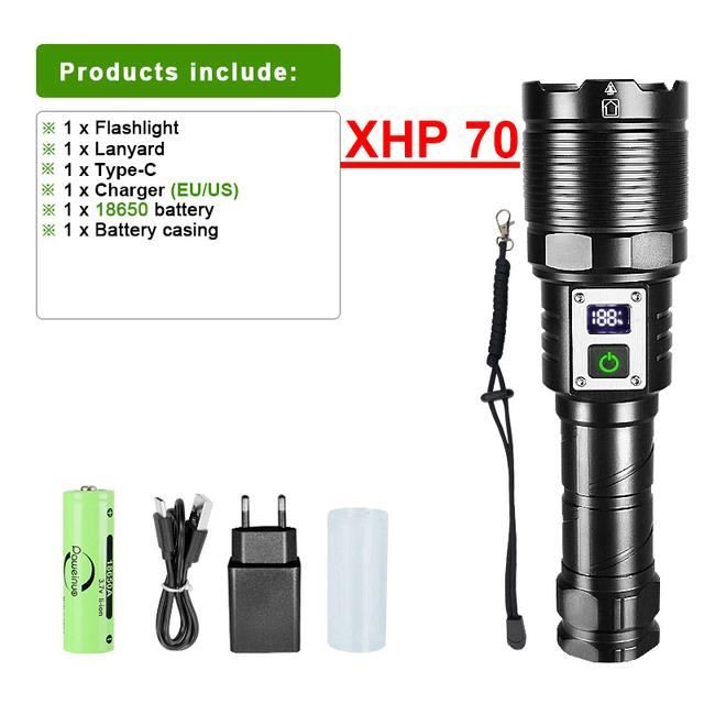 Portable et fiable, la torche tactique est pratique à ranger dans votre camion, votre équipement de camping ou votre kit de survie. GEARLITE Lape de Poche 2 Pièces, 3000 Luens Lape Torche LED Ultra... Acheter Lampe Torche led Puissante 6000 Lumens, XHP70 Lampe Torche Rechargeabl pas cher dans le rayon Lampes torches sur : les meilleurs sites classés par prix, stock, et frais de livraison. La torche LED XHP70,2 est livrée avec une batterie rechargeable de haute capacité. Lampe torche haute puissance équipée de 4 cœurs puce LED XHP70., 2, luminosité maximale jusqu'à 6000 lumens, une puissante source de lumière illumine la route dans la nuit avec 5 modes d'éclairage (High-Medium-Low-Strobe-SOS) Les fonctions flash et SOS vous sauvent la vie lors des réparations en bordure de route ou de la signalisation de l'aide. Contenu de l'emballage: 1 x XHP70., 2 Lampe torche rechargeable puissante 1 x Batterie rechargeable 1 x câble de chargement USB La torche rechargeable a un indicateur de charge, avec une protection contre les surcharges et une protection contre les surintensités pour rendre le processus de charge plus pratique et plus sûr. Très fiable et facile à utiliser, c'est la lampe de poche parfaite à avoir en camping, en randonnée, à la chasse, en explorant ou même pour emmener les enfants dehors., 1., Billes: XHP70., 2 2., 5 -Modes: 100% - 70% - 50% - Stroboscope - SOS 3., Lumen: Max jusqu'à 6000 Lumens 4., Source d'alimentation: 1 batterie rechargeable (batterie incluse) 5., Matériel: Aluminium durable de qualité aéronautique 6., Imperméable: IPX6, pas pour la plongée 7., Indicateur d'alimentation: Disponible 8., Mise au point réglable: Disponible 9., Sortie USB: Disponible Conseils chauds: 1., Veuillez retirer le film de protection et charger complètement la batterie avant utilisation., 2., La direction positive de la batterie est la même que celle de la tête de la lampe de poche, et le pôle négatif de la batterie est la même que la queue de la lampe de poche., 3., Veuillez retirer la batterie si la lampe de poche n'utilise pas fréquemment pendant une longue durée de vie. Torche tactique en alliage d'aluminium de haute qualité, ce qui a considérablement amélioré ses performances de dissipation thermique et rend la lampe de poche plus fiable et durable. Lampe Torche Puissante Lampe Torche LED Puissante 6000 Lumens, XHP70 Lampe Torche Rechargeable Lampe De Poche Avec Indicateur De Puissance Zoomable 5 Modes Pour Le Camping Peche Randonneebatterie Incluse 88584221 Torche Led Puissante Rechargeable Lampe torche haute puissance équipée de 4 cœurs puce LED XHP70.2, luminosité maximale jusqu'à 6000 lumens, une puissante source de lumière illumine la route... Lampe torche LED ultra puissante, 600 000 lumens, lampe