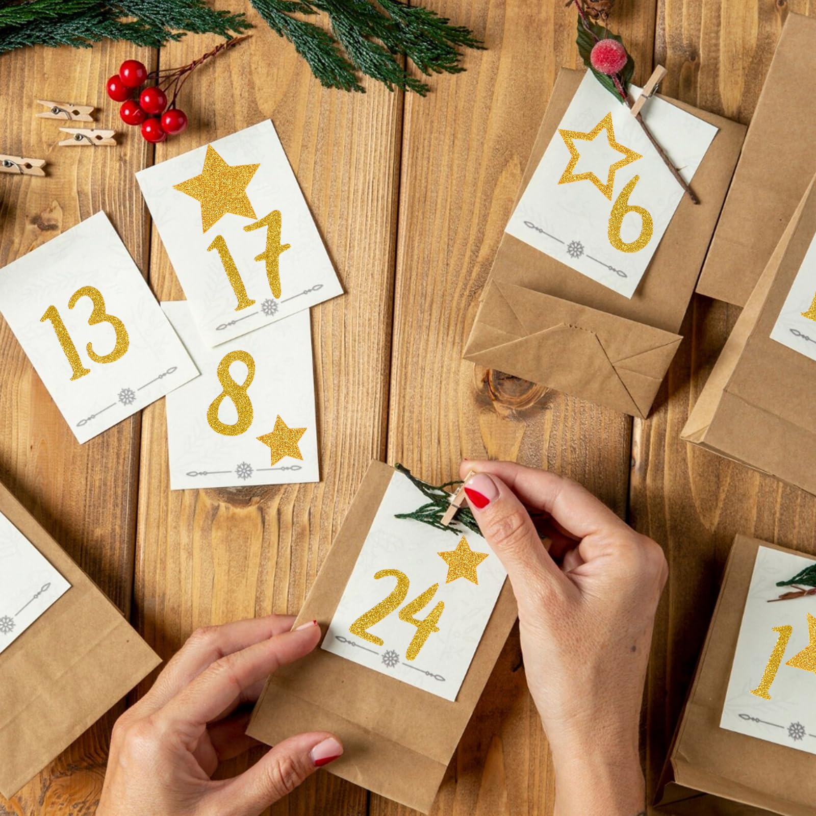 Stickers de Noel chiffres calendrier de l'avent - Rouge Cadre en étoiles dorées sur fond bleu isolé, bordure d'angle en étoiles dorées brillantes, modèle de carte de vœux de Noël, toile de fond des fêtes, étoile Sacs de calendrier de l'Avent - Autocollants en feutre blanc imprimées sur mesure (1-24) pour un compte à rebours de vacances unique. Idéal pour les sachets cadeaux de Noël. Commandez en vrac maintenant Une feuille dans un paquet BSB Autocollant de Noël avec Chiffres 1 à 24 sur étoiles dorées : : Cuisine et MaisonRetours & garanties légales: Demandez le retour d'un produit jusqu'à 14 jours après sa réception, sans motif, pour obtenir un remboursement complet (prix et frais de livraison) au titre du droit légal de rétractation. permet en plus les retours jusqu'au 30ème jour et le... Chiffres Autocollants Kit Déco De Noël | Sachet De 50 Stickers Chiffres Brillants Chiffre Pour Calendrier De L'avant Autocollants de Noël avec chiffres de 1 à 24 sur étoiles dorées., Autocollant de Noël Autocollants de Noël