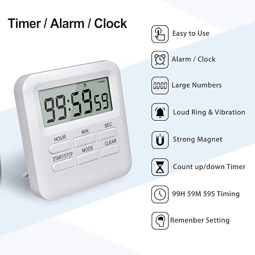Il peut être appliqué à la cuisine, au laboratoire, à l'école, aux sports, aux jeux vidéo ou au temps d'affichage de l'écran de télévision, aux activités des enfants, aux devoirs, aux sports, etc. MINUTERIE RÉINITIALISABLE ---- En même temps, il a les fonctions de compte à rebours du temps de suivi et de comptage, et de compte à rebours de 2 canaux simultanément, la précision de synchronisation maximale est de 99Hr / 59Min / 59Sec. Il existe des boutons séparés qui peuvent être réglés indépendamment (T1, T2)▶ Le temps de suivi du compte à rebours et la plage de comptage direct sont tous deux de 99Hr/59Min/59Sec,avec une fonction de comptage avec une résolution de 1/100 seconde. HORLOGE ---- Afficher les heures / minutes / secondes (AM / PM), régler une date spécifique via des boutons indépendants, facile à utiliser, l'alarme est forte et claire, pas dure et facile à entendre dans une autre pièce. Jayron Desktop Digital Countdown Timer Minuteur de Cuisine Chronomètre,Comptage,Trou de suspension magnétique Alarme forte,Batterie remplaçable,pour Mariage Retraité Fitness Travail Cuisine(Noir et peut être utilisé comme horloge pour enrichir la vie quotidienne . Achetez Jayron Minuterie à 2 canaux avec horloge Minuterie de cuisine Compte à rebours magnétique Réveil numérique Minute / seconde Minuterie numérique Horloge de bureau Horloge électrique Sto. Démarrez deux minuteries en même temps. Gestionnaire du temps de la vie. Évitez d'appuyer accidentellement au début ou de répéter le réglage du même intervalle. Équipée d'un aimant puissant, cette minuterie se fixe facilement sur n'importe quelle surface métallique, offrant une utilisation pratique dans les cuisines ou... Enfin, il est léger et facile à transporter. Jayron Minuterie à 2 canaux avec horloge minuterie de cuisson magnétique compte à rebours minuterie numérique Minute/seconde minuterie horloge de bureau horloge électrique chronomètre minuterie pour : : Cuisine et maisonOù avez-vous vu un prix plus bas ? Fields with an asterisk * are required Site Web de détaillant (En ligne) URL *: Prix (EUR L'heure par défaut est PM12: 00 Vous pouvez utiliser un aimant puissant pour le coller sur la porte du réfrigérateur ou du four, ou utiliser le cadre de support pliant pour le placer directement sur la plate-forme, ou utiliser le trou de suspension pliable pour l'accrocher au mur et à d'autres surfaces. 2 Autre:▶ Taille de l'écran LCD: 62 mm * 43 mm▶ Composants: manuel d'utilisation; produit▶ Taille du produit: 85 mm * 90 mm * 22 mm▶ Poids: 107g▶ Plage de test de température: 0- + 60 °C▶ Plage d'humidité: 20% -95% HR▶ Certificat CE▶ Garantie de deux ans3 Fonctionne sur:▶ Ce produit est largement utilisé dans la cuisine de cuisine dans la vie de famille, le contrôle du temps des jeux de lecture pour enfants, le chronométrage du temps de beauté des femmes, le calendrier des réunions de bureau, le calendrier des exercices, les laboratoires de l'école, les activités des enfants, etc. Minuteur De Cuisine Jayron JR-KT001 Minuteur Numérique, Grand écran LCD 3 Canaux, Compte à Rebours, Minuterie De Cuisine, Réinitialisation De L'horloge, Support Magnétique Puissant, Batterie Remplaçable, Noir Minuteur Enfant 1 Caractéristique du produit:▶ Système 12 heures▶ Avoir 2 canaux pour le compte à rebours/compte à rebours en même temps.