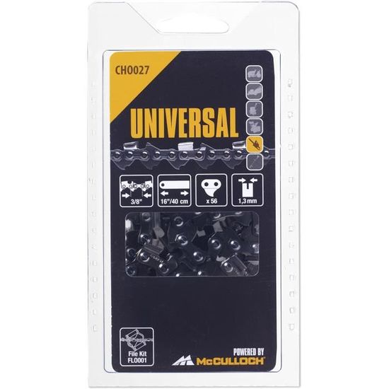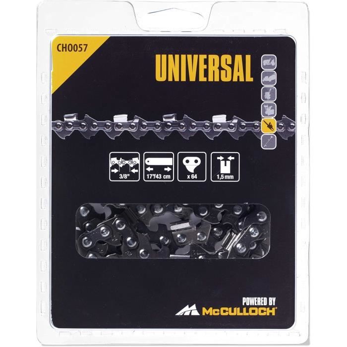Chaîne pour guide de 30 cm 3/8 1,3mm 44 entraineurs pour tronçonneuse 【SUPER ❗ OFFRE】➤Chaîne de tronçonneuse - 57 Maillons - Pas 3/8LP - Jauge 0.50 (1.3mm) - Guide de 40 cm au meilleur prix sur ✔️Prix bas✴️En stock ⚡️Livraison Rapide Réduction du rebond, Rapide et plus agressive, Coupe 3/8 plus longue pour une durée de vie accrue, Idéal pour un travail dans des conditions difficiles, Pour affûter, utiliser une lime de 5,5 mm - FLO005 Poignée de lime - FLO006 et Lime plate - FLO007 Compatible avec : - McCulloch et la plupart des grandes marques Qualité McCulloch : Les accessoires pour tronçonneuses sont de qualité McCulloch éprouvée et peuvent être utilisés pendant longtemps Chaîne Pour Tronçonneuse Type 03-A56 3-8 '' - Pouce, Longueur Du Guide... Homme Accessoire Chaîne Universal, CHO057 : Chaîne Pour Tronçonneuse, 17 Pouce Chaine Tronconneuse Stihl 35 Cm Chaînes Universal pour tronçonneuses – Chaînes de rechange de haute qualité : Les chaînes UNIVERSAL sont disponibles en différentes tailles et sont compatibles avec les guides les plus courants de marques connues. Elles se caractérisent par une longue durée de vie et contribuent à prolonger la durée de vie de votre équipement.