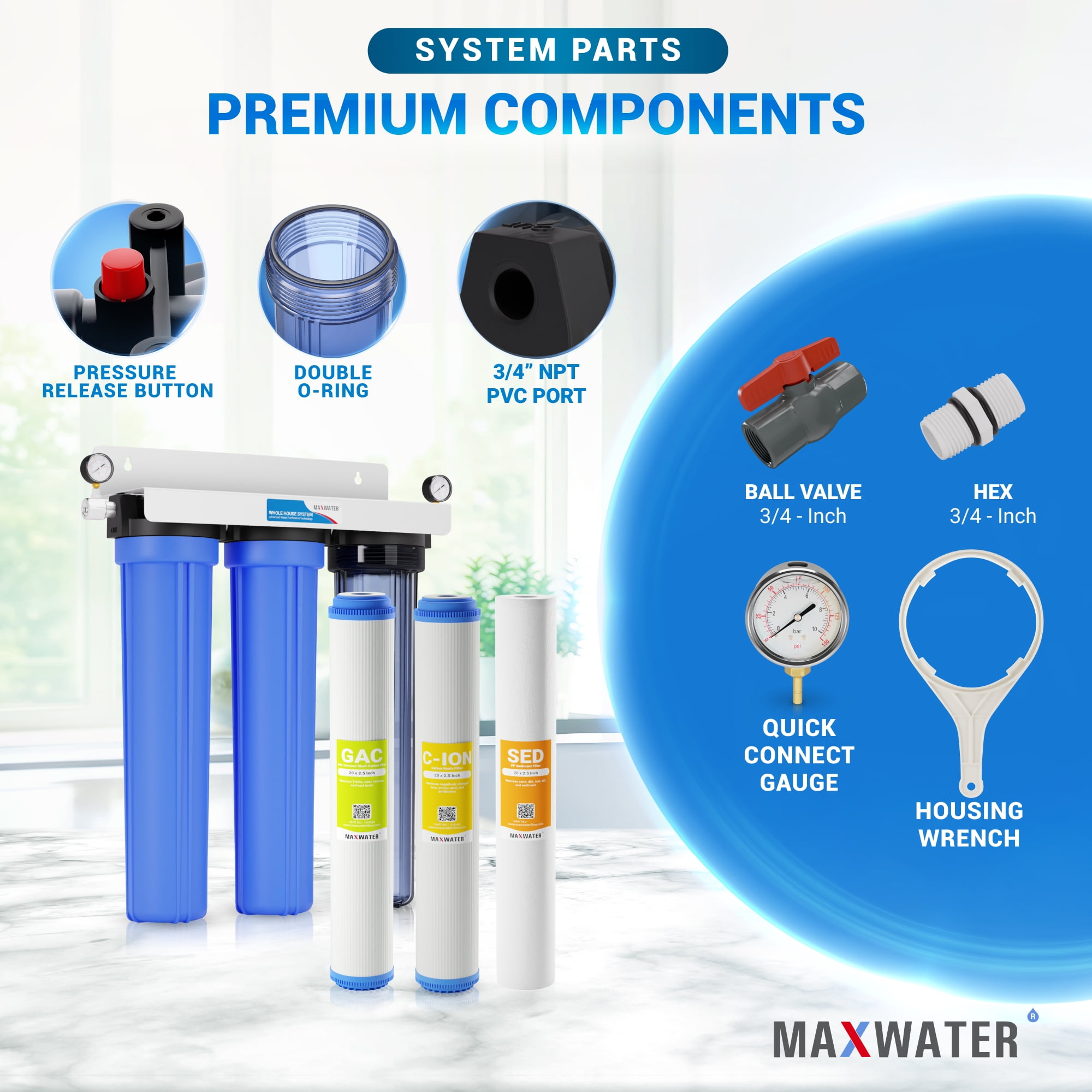 Nous incluons une clé pour filtre afin de faciliter les remplacements de cartouche. Notre filtre à eau pour toute la maison dispose d'un puissant filtre CTO à 1ère étape (FC15B) qui élimine la nuagosité, les mauvais goûts et les odeurs. Choisir un système de filtration de l’eau | Castorama Filtration Efficace à Deux Étapes avec Filtre Anti-Calcaire : Notre filtre d’eau pour toute la maison est équipé d’un puissant filtre CTO en première étape (FC15B) qui élimine la turbidité, les mauvais goûts et les mauvaises odeurs. Capacité de Filtration Exceptionnelle : Jusqu’à 50 000 gallons d’eau propre par an pour une famille de 4 personnes avec filtres 10x4., 5. Avec une garantie de remboursement de 30 jours et une garantie d’un an, notre système de filtration inclut également une extension de garantie après enregistrement chez iSpring. Notre inhibiteur de tartre breveté séquestre efficacement le calcium et le magnésium, empêchant ainsi l’accumulation de tartre et nettoyant les conduites partiellement obstruées. Si vous rencontrez le moindre problème avec nos produits, contactez-nous immédiatement. Consultez notre manuel complet et nos vidéos YouTube pour installer ce système de filtration au point d’entrée (POE) de l’arrivée principale d’eau et profitez d’une eau propre et saine pour toute votre famille. Préserve les Minéraux Essentiels : Contrairement à un système d’osmose inverse, notre système de filtration ne réduit PAS les Solides Dissous Totaux (TDS), garantissant que votre eau conserve les minéraux essentiels bénéfiques pour la santé. Installation et Remplacement Faciles : Le système est préassemblé sur un support de montage pour une installation simple et en toute autonomie. Filtre A Eau ISpring WGB21B Système De Filtration D'eau En 2 étapes Pour Ispring Whole House Water Filter Nobleza - Filtre d'Aquariu, Filtre d'Aquariu 3-en-1 à Suspendre 400 L... De plus, une soupape de décompression permet de libérer en toute sécurité la pression accumulée lors des changements de filtres. Raccords 1 pouce assurant un débit rapide et stable.