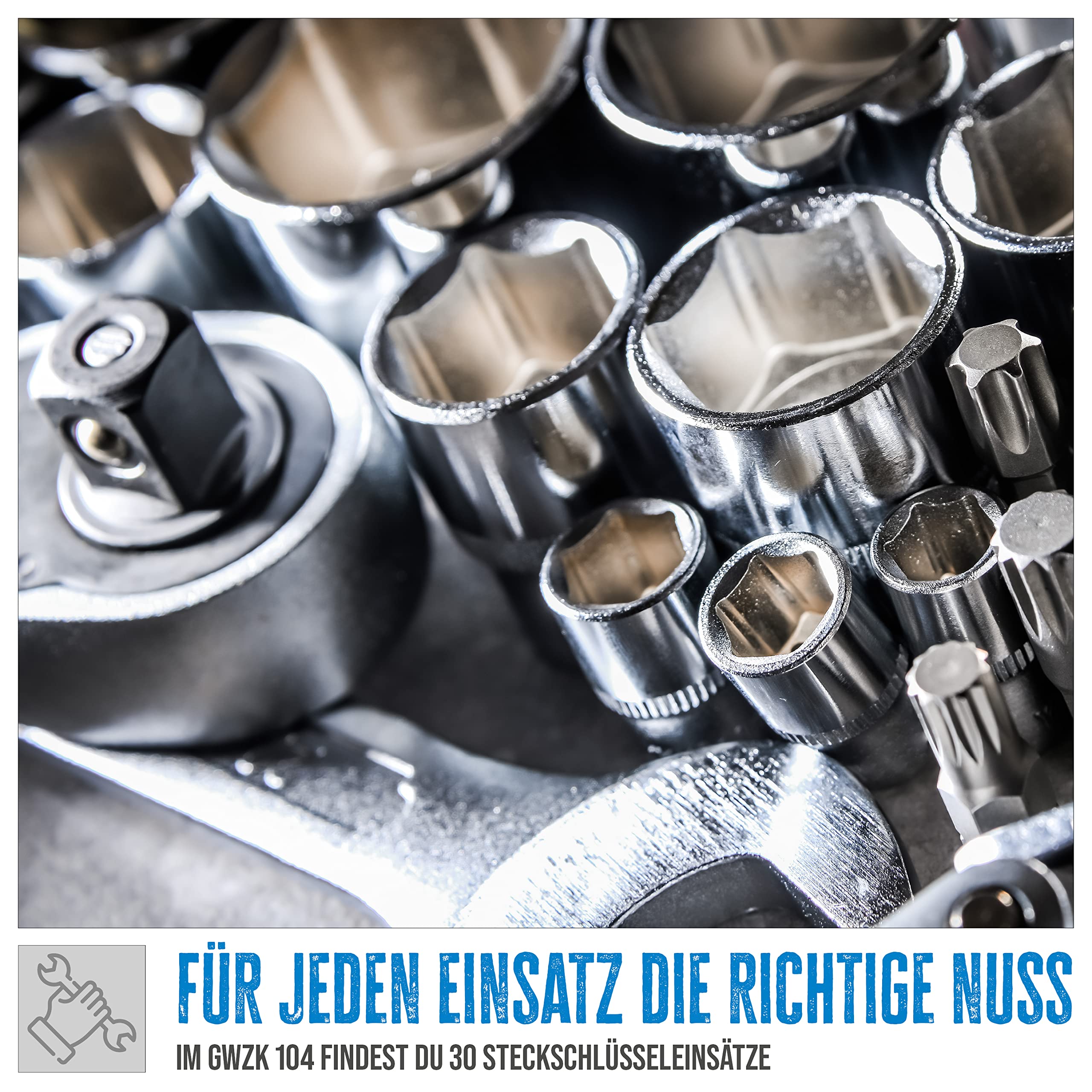 Contenu de la livraison : 6 clés polygonales : 8, 10, 12, 13, 14, 17 mm 60 embouts 6,3 mm : Ph0, PH1, PH2, PH3, PZ0, PZ1, PZ2, PZ3, six pans creux : T10, T15, T20, T25., 30, T4., 0 six pans creux : H2, H3, H4, H5, H6 carré : S0, S1, S2, S3, Fente: SL3, SL4, SL5, SL6, SL7 1 tournevis avec fonction cliquet, 1 adaptateur embout 6,3 mm (1/4), 1 cliquet réversible 1/2 + rallonge 5, 14 fiches Douilles 1/2 : 10-15, 17-19, 21-24, 27 mm 2 douilles de bougie longue 1/2 : 16, 21 mm 1 cliquet réversible 1/4 + rallonge 4 10 douilles 1/4 : 4-13 mm 6 douilles longues 1/4 : 6, 7, 8, 1 0, 12, 13 mm Güde Werkzeugkoffer GWZK 157 Neuware in Niedersachsen - Dassel... GÜDE Werkzeugkoffer GWZK 104 Werkzeugset 104 teilig in Kunststoffkoffer Mallette à outils complète et de haute qualité, idéale pour toutes les tâches de maintenance et de bricolage ou de réparation. Servante D'atelier Complète Avec Outils Boite à Outils 399 Pièces BM TOOLS BMT-399-PCS En Chrome Vanadium | Mallette En Aluminium Trolley | Leroy Merlin Caisse A Outil Complete Dieses Werkzeug-Set im praktischen Koffer bestehend aus 104 Teilen. Es umfasst 2 Ratschen (1/2 und 1/4 mit 72 Zähnen) mit passenden Steckschlüsseleinsätzen in kurz und lang, sowie entsprechende Verlängerungen Ce kit d'outils dans un coffret pratique composé de 104 pièces. Un grand assortiment d'embouts, un tournevis d'embouts avec fonction cliquet, ainsi que tous les adaptateurs nécessaires et 6 clés à fourche complètent ce kit.