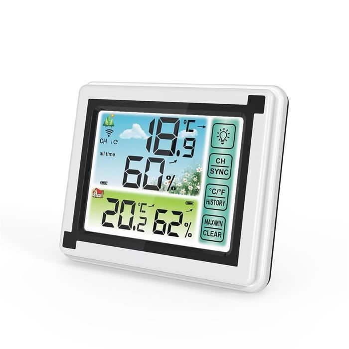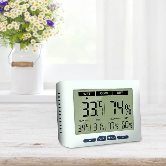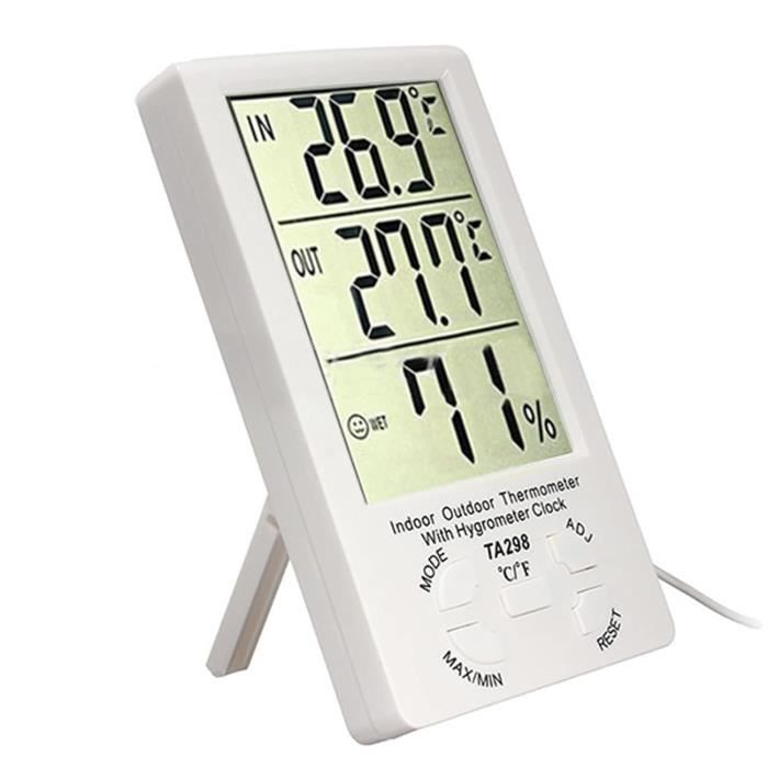 Description : Taille: 83x75x21mm/3., 27x2., 95x0., 83inch Plage d'enquête de température: 0℃-50℃ Plage d'enquête d'humidité: 10%-99% Analysez le degré: 0., 1℃, 1%RH Degré d'erreur: température ± 1 ° C humidité relative ± 5% Utilisation du bouton : F/C: appuyez sur la touche C/F, vous pouvez choisir d'afficher la température en celsius ou fahrenheit MAX/MIN: appuyez une fois sur la touche MAX/MIN pour afficher la période maximale de la température intérieure de mesure MAX- et humidité; Puis appuyez à nouveau sur la touche MAX/MIN pour afficher la période minimale de mesure MAX- température intérieure et humidité. Bouton de fonction pratique pour vérifier la température/humidité minimale et maximale enregistrée - Thermomètre/hygromètre compact avec grand écran LCD facile à lire. Thermometre Exterieur ThermomèTre HygromèTre NuméRique Avec éCran LCD Clair, HumidimèTre Pour La , ThermomèTre Thermometre Connecté Digital LCD Thermomètre Hygromètre Intérieur, Thermomètre Numérique de Bureau Portable, avec Horloge | À partir de 3,00 € | Comparez les prix avec Zoo Mania Thermomètre Hygromètre Numérique Lcd Avec 3 Capteurs, Compteur D... RESET: appuyez sur cette touche pour effacer tous vos réglages Contenu de l'emballage : 1 x Thermomètre LCD numérique (sans batterie) ZALE Station Météo Sans Fil Avec Capteur Extérieur Thermomètre et... - Contenu de l'emballage : 1 thermomètre numérique LCD (sans batterie) Affichage clair de l'heure avec fonction d'alarme Station Météo Sans Fil Avec Capteur Extérieur Thermomètre Numérique Hygromètre Fonction Réveil