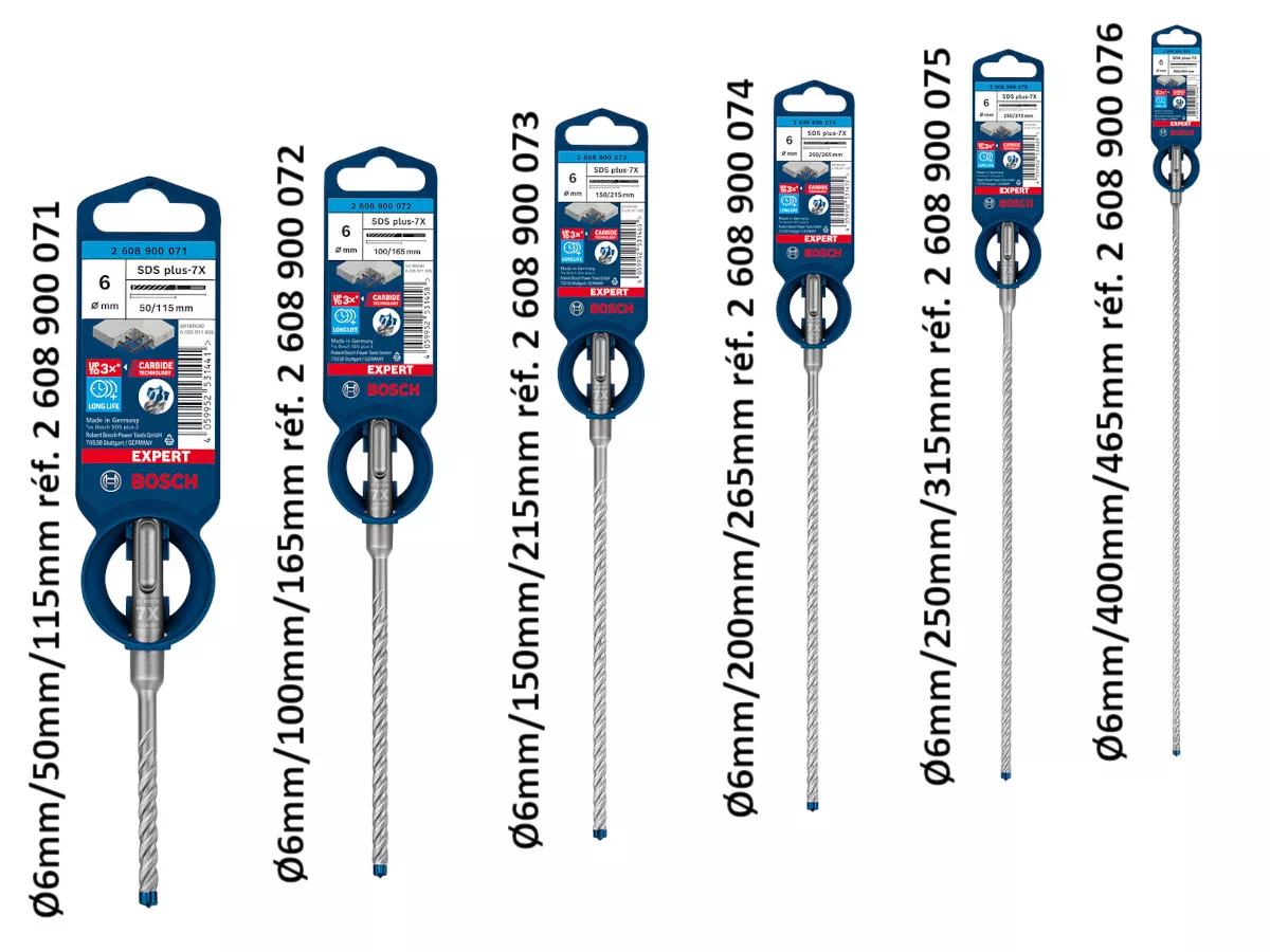 Pour un perçage efficace du béton et du béton armé, par exemple lors de travaux d'installation, y compris d'installations électriques ou d'autres aménagements intérieurs Foret 5 à 16mm béton SDS PLUS-7X Expert - 4 taillants BOSCH. 4,93 € HT5,92 € TTC9,22 € HT. Stock selon réf. Ajouter au panier. Ajouter à la liste d'achats... Bosch SDS Plus-5X Hammer Drill Bit (10 Pack)- Sizes From 5mm-16mm in Convient à tous les marteaux burineurs SDS plus Bosch Sds Plus 5x 1X Foret Pour Perforateur Expert Sds Plus-7X (Pour Béton Armé, 22 Foret Sds 6mm Matériau. Métal · Diamètre de coupe. 6,5 Millimètres · Type de finition. Chrome · Type de tige. SDS-plus · Marque. BOSCH · Dimensions de l'article L x l x H 29,5 x... Dure jusqu'à 1,5 fois plus longtemps qu'un foret Bosch SDS plus-1 Très efficace pour les professionnels de l'aménagement intérieur, les électriciens, les plombiers et les installateurs de CVCA : Longue durée de vie