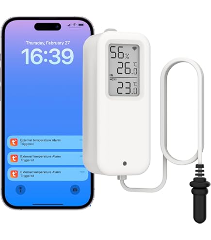 Kit thermoemter WiFi pour congélateur - Plus longue distance, plus pratique, plus de tranquillité d'esprit Contenu de la livraison : 1 hub WiFi H5Pro., 2 thermomètres LS2., 2 câbles de sonde de 1,5 m., 1 antenne LoRa., 1 adaptateur. Les paramètres intelligents de l'application tels que « alerte de batterie faible » et « anti-fausse alarme » améliorent la sensibilité de la surveillance L'écran LCD offre une surveillance en temps réel, ce qui en fait un tableau de bord complet pour l'examen des données historiques, les alarmes, l'horloge, la météo et les mises à jour du calendrier (prend uniquement en charge le Wi-Fi 2,4 GHz) Capteur Température Smart Life MOCREO Thermomètre WiFi Pour Réfrigérateur Avec Alarme De Congélateur, Alerte E-mail, Notification D'application, Enregistrement De Données, Exportation, Sans Frais D'abonnement, 2 Capteurs De Sonde Temperature Connectée Mots clés : thermomètre;thermo;température Thermostat connecté à distance WiFi Tuya chauffage maison intelligente... 1 câble d'alimentation., 6 piles AAA., Velcro x 2 Caméra Endoscopique, Serpent Endoscope 1080P Wifi Caméra D'Inspection... 2 ans d'exportation de données : le capteur de température ne nécessite aucun abonnement, prend en charge l'affichage de graphiques clairs en ligne, et permet l'exportation de données de 2 ans au format CSV pour une analyse approfondie 3 alertes optionnelles : le moniteur de température à distance offre des notifications push, des alertes par e-mail et un bip de 80 dB pour une action rapide. Thermostat connecté à distance WiFi Tuya chauffage maison intelligente