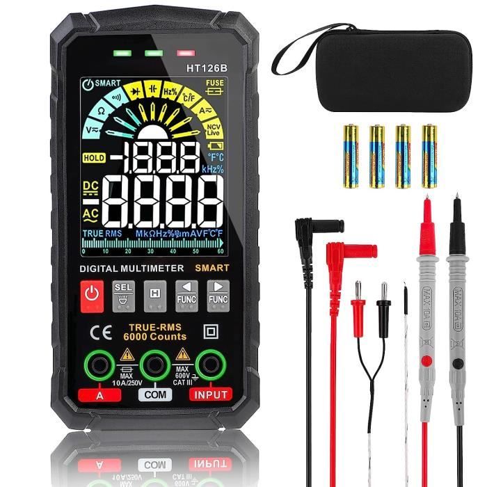 Lecture Clair et Double Affichage – Équipé d’un écran LCD couleur haute définition avec double affichage numérique et bargraphe analogique, le multimètre garantit une lecture claire même sous forte lumière ou dans des angles obliques ; parfait pour les travaux de bricolage et les interventions électriques Fonctions Complètes dans un Design Compact – Mesure du courant AC/DC, résistance, capacité, fréquence, rapport cyclique, diode, continuité, détection NCV et identification de ligne sous tension ; format long 162 mm ergonomique et facile à tenir Utilisation Confortable et Kit Complet – Lampe torche intégrée, rétro-éclairage, arrêt automatique, alerte de basse tension ; fourni avec cordons de test, pinces crocodiles, sac de rangement et piles AAA pour une utilisation immédiate Pince Electricien Neoteck Multimètre Numérique 6000 Comptes Gamme Détection Automatique Pince Amperemetrique Ac/dc Achetez maintenant chez VEVOR. Multimètre Automatique Numérique, TRMS 6000 Comptes (Guide de Bornes... AstroAI ultiètre Nuérique Autoatique TRS 10000 Coptes, ultiètre