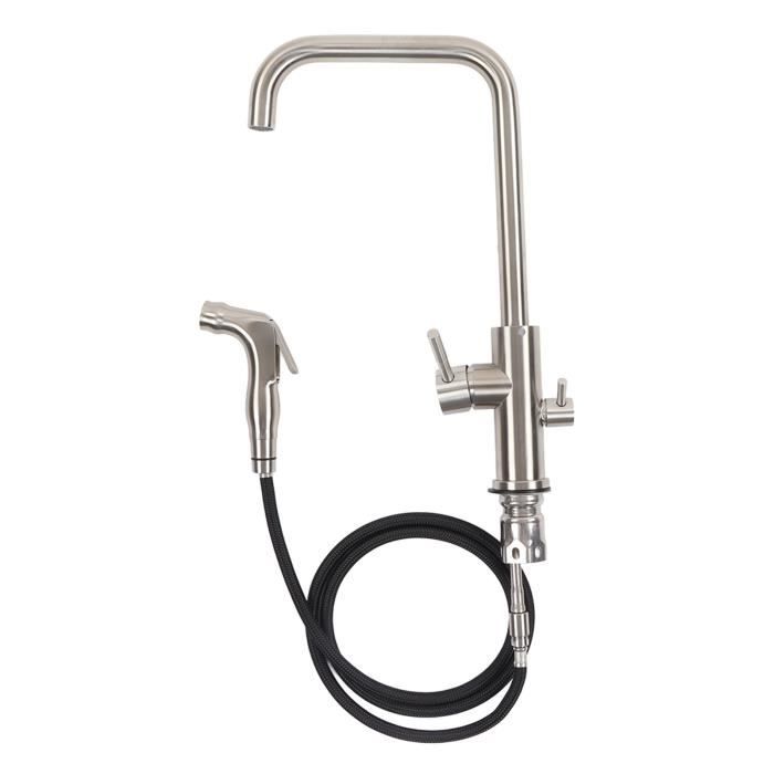 Caractéristiques du produit : - Maximum 1,8 gpm à 60 psi, 6,8 l/min à 414 kPa. Pour éliminer les dépôts de calcium, utilisez du vinaigre blanc ordinaire dilué dans l'eau et rincez à l'eau claire. - Support 1, 2, 3, 4 trous (plaque de plateau/rosace en option 79717 Mo, vendu séparément) - Lignes d'alimentation de 60 cm de long incluses, avec raccord de compression de 90 mm (plus longues lignes d'alimentation de 80 mm 795BY1 et 1/2 femelle par adaptateur mâle de 90 mm 792AD1, vendu séparément) - Hauteur : 39,6 cm. Le bec verseur à arc haut pivote à 360 degrés avec un tuyau rétractable de 50,8 cm et un pulvérisateur à double fonction pour plus de commodité lors des tâches quotidiennes de cuisine. About this item Dure plus longtemps avec une construction en acier inoxydable massif sans plomb et des composants de qualité supérieure pour une utilisation sans fuite. La finition inoxydable de luxe résistante aux taches empêche les traces de doigts et les taches d'eau pour un look plus propre, ne se décolore pas et ne ternit pas au fil du temps Le bec verseur à arc haut pivote à 360... ML-Design Évier De Cuisine En Acier Inoxydable, 34x40 Cm, Argenté Nous croyons en la puissance du design a un impact positif sur la vie des gens. - Pulvérisateur magnétique double fonction avec trous de pulvérisation faciles à nettoyer. - Portée du bec : 22,1 cm. Facile à installer : tout ce dont vous avez besoin est ensemble dans une boîte, lignes d'alimentation de 59,9 cm incluses, plombiers et outils spécialisés non nécessaires, ce qui permet d'économiser à la fois du travail et de l'argent. Le robinet de cuisine noir et doré dure plus longtemps – avec une construction en acier inoxydable massif sans plomb et des composants de qualité supérieure... Veuillez vous référer au manuel (page 15) pour plus de détails. Dégagement au dosseret 3,8 cm Entretien et nettoyage : Pour le nettoyage quotidien de votre robinet, utilisez un chiffon doux humidifié avec de l'eau et un détergent doux ou du savon, si nécessaire. N'utilisez jamais de poudre à récurer, de laine d'acier ou un détergent qui dissout le calcium, acide ou contient de l'alcool ou un abrasif. Robinet d'évier de cuisine Darnok 79723BX Mia avec - Taille du trou pré-percé : 3,8 cm à 3,8 cm., - Max. Rincer à l'eau et sécher/polir avec un chiffon propre et sec. - Poignée intelligente de style minimaliste. - Col de cygne pivotant à 360 degrés avec tuyau rétractable de 50,8 cm. - Facile à installer grâce au système de connexion rapide. Dure plus longtemps avec une construction en acier inoxydable massif sans plomb et des composants de qualité supérieure pour une utilisation sans fuite. Après l'installation, veuillez enregistrer votre produit à temps pour obtenir une garantie à vie limitée