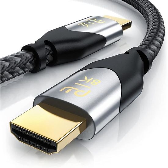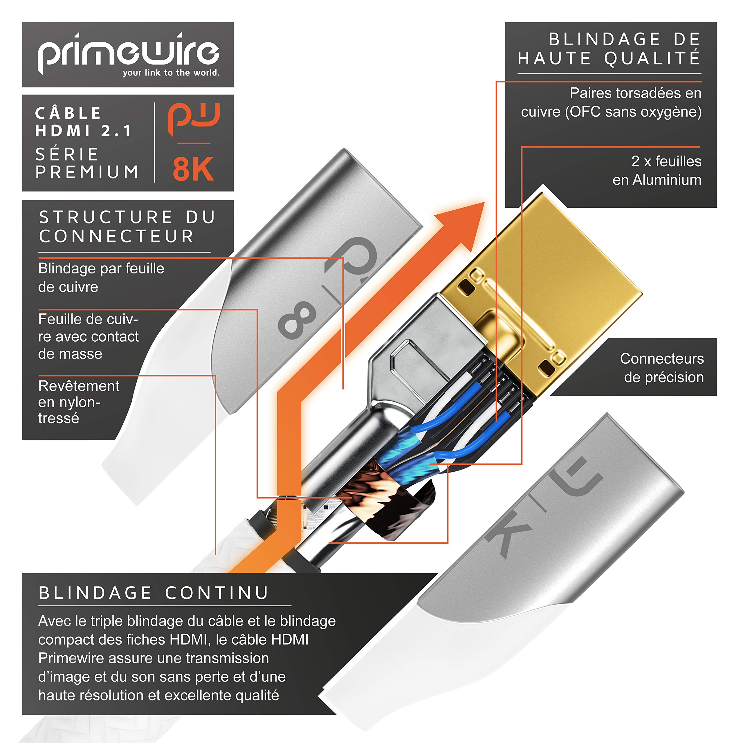 Modèle Primewire 2 mètres : profitez des vidéos HD et des signaux audio en haute qualité ! Le câble HDMI 8K Primewire est conforme à la norme HDMI 2., 1 et transmet des images en excellentes et hautes résolutions : jusqu‘à 7680 x 4320 @ 120 Hz (avec DSC) et 7680 x 4320 @ 30 Hz (sans DSC). Transmet tous les formats audio numériques tels que 2., 0, 2., 1, 5., 1, 7., 1, DTS-HD Master Audio, Dolby TrueHD, Dolby Digital, DTS, etc. En 4k, le câble offre la résolution la plus idéale avec des taux de rafraîchissement élevée (dépendant de la carte graphique et d’écran) 5120 x 2880 @ 60 Hz (sans DSC) et 5120 x 2880 @ 120 Hz (avec DSC) | 3840 x 2160 @ 144 Hz (sans DSC) / 240Hz (avec DSC) | 2560 x 1440 @ 240 Hz ; 1920 x 1200 @ 240Hz. Cable hdmi 2.1 5 mètres professionnel 8K 4K 120Hz ultra HD 3D HDR 48GB Caractéristiques du produit Câble HDMI à l'épreuve du temps selon le standard Ultra High Speed, offre HDR, ARC, 3D, espace colorimétrique 10bit, YcbCr 4:4:4, Highspeed Ethernet Découvrez une véritable sensation de cinéma / lecture vidéo 8K jusqu'à 120 Hz !, Résolutions : les jeux en 8k seront assurés. 1 RÉSOLUTION 2 GAMING & OFFICE 3 ENTERTAINMENT Transmission de données avec DSC 8k: 7680 x 4320 @ 120 Hz (DSC), 5k: 5120 × 2880 @ 120 Hz (DSC) Parfait pour tous les appareils HDMI tels que les télévisions 4K et 8K, Playstation 5 (PS5) , PS4 Pro, PS4, PS3, , XboX One X, lecteurs Blu-ray 4K, etc : 304384., Connectivité : connexion de composants AV compatibles Internet avec ARC (Audio Return Channel). Extendeur splitter HDMI 4 sorties sur RJ45 4K 30Hz POC - 70 mètres... Parfait pour tous les appareils HDMI comme les téléviseurs 4K et 8k, PlayStation 4 et 5, Xbox One X et S, Xbox Series X et S, lecteurs Blu-ray 4k Cable Hdmi 4m Primewire - 2m Câble 8K 4k 2 Mètres, 8 K @30Hz @120Hz DSC, 4 K Hdmi 2.1 PremiumCord 8K@30Hz, 4K@120Hz adaptér HDMI to DisplayPort Female/Male s... Triple blindage du câble (1 x tresse métallique, 1 x feuille métallisée sur toutes les paires de fils, 1 feuille, par paire), Rétrocompatible avec 2., 0 a/b, 1., 0, 1., 1, 1., 2a, 1., 2, 1., 3, 1., 3a/b/c, 1., 4 / 1., 4b) HDR, ARC, 3D, espace couleur 10bit, YcbCr 4:4:4, Etherne. Copper Foil : les connecteurs sont protégés contre les signaux parasites par une feuille de cuivre supplémentaire dans le connecteur. Bande passante jusqu'à 48 Gbit/s & supporte 16 bpc ou 48 bits par pixel 4k: 3840 x 2160 @ 240 Hz (DSC)