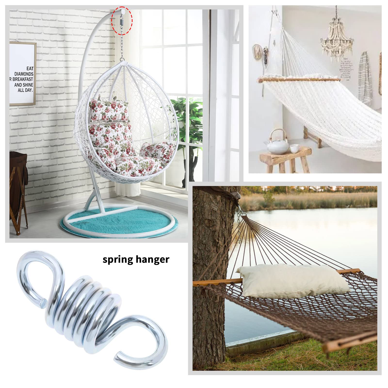 Longueur 108 mm, largeur 40 mm, diamètre 7 mm, avec des crochets aux deux extrémités, connectez simplement tout ce dont vous avez besoin pour accrocher, sans outils ni opérations compliquées. 6 Pcs - Décoration X Sac Ressort Hamac Suspendu Pouces Cintres Jardin Vous pouvez remplacer l'ancien pour garantir votre sécurité et celle de votre famille. ✨Équipé d'un crochet, d'une vis et d'un ensemble de boulons et de... Crochet Plafond YIXNSW Lot De 2 Pièces Crochets De Suspension, Ressort De Hamac Supporté Chaise à Ressort, Pour Chaises De Porche Balançoires à Suspendre, Argenté Fauteuil Suspendu Spécification: Matériel: Métal Couleur: Argent Taille: 108 x 40 x 7 mm / 4,25 x 1,57 x 0,28 Pouces Quantité: 2 Pièces Le Forfait Comprend: 2 x Ressort de Hamac Remarques: 1., En raison des différents paramètres d'éclairage et d'écran, la couleur de l'élément peut être légèrement différente de celle des images., 2., Veuillez permettre de légères différences dans les mesures en raison de différentes mesures manuelles., 3., N'hésitez pas à nous contacter si vous avez des questions. 2 crochets, chaise à ressort hamac, convient pour chaise de porche... Robuste et plus sûr. Nos ressorts pour chaises suspendues peuvent être utilisés pour des hamacs, des sacs de boxe, des balançoires, des serviettes de yoga, des chaises suspendues pour enfants, des balançoires pour enfants, des chaises flottantes, des sièges suspendus, des balançoires d'amour, des entraîneurs de fronde et bien plus encore. L'ensemble de ressorts de balançoire pour fauteuil suspendu permet une balançoire douce et confortable, le ressort en acier peut sauter avec l'amplitude, et se balance ou tourne confortablement, ce qui détend le corps humain. Facile à utiliser : convient pour à charnière gauche ou droite, fixé avec ressort, pratique pour l'ouverture fermeture Conception d'anneau traction, empêchan