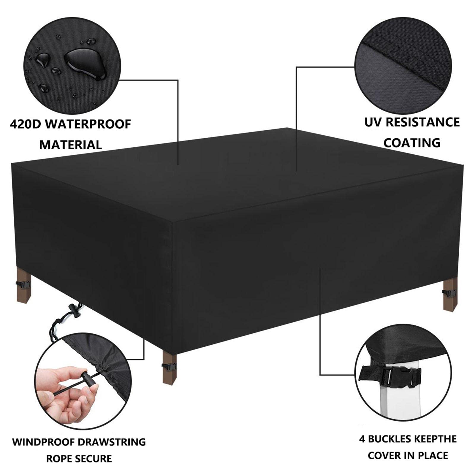Taille de la housse meubles de jardin:la housse de protection convient pour recouvrir des tables et des chaises, des tables de terrasse rectangulaires, des meubles en rotin ou des meubles de jardin ovales. Housse Salon de Jardin, 190x190x100cm Housse Table de Jardin imperméable, Housse de Meubles de Jardin Rectangulaire Imperméable Anti-UV 420D Tissu Oxford Bache Table Exterieur Conseils chaleureux:-Veuillez prévoir une différence de 1 à 3 cm en raison de la mesure manuelle. Placez des objets légèrement plus hauts sous le couvercle de la table pour soutenir la partie centrale, de sorte que l'eau et les débris puissent s'écouler vers le bas. -Évitez de rayer le couvercle du meuble par des objets pointus. Les bords à double couture sont résistants aux déchirures et aux déchirures et offrent une protection toute l'année pour votre meubles extérieur. (Remarque: s'il vous plaît ne mettez pas dans la machine à laver., ) Couverture et protection complètes pour toutes les saisons - Aide à protéger contre les dommages causés par les blizzards, la saleté, la poussière, les fientes d'oiseaux,et gardez votre canapé de patio préféré au sec et en sécurité. -Cordon de serrage et boucles réglables,la bâche de protection pour meubles de jardin ne sera pas soufflée par le vent. Si le vent est trop fort, nous vous suggérons de mettre des pierres ou des objets lourds sur la couverture de la table extérieure pour mieux éviter que la couverture ne se détache. Les couvertures de meubles peuvent être facilement pliées et réutilisées. -La couverture n'est pas ignifuge. Housse Salon de Jardin Exterieur 160x160x100cm 420D Housse de Meuble Oxford Tissu Meuble de Jardin de Étanche, Bâche Salon de Jardin Imperméable Anti-UV, avec Corde et Boucle Verrouillage La meilleure housse de protection pour les meubles de jardin été comme hiver. Veuillez tenir à l'écart des flammes nues et des autres sources d'ignition. Housse Salon De Jardin 160x100x105cm ImperméAble Anti-Uv Tissu Oxford 420D Housse De Protection DifféRentes Tailles Housse De Table Jardin Rectangulaire Avec Corde Et Boucle Verrouillage - Noir Veuillez vérifier la taille de votre mobilier d'extérieur avant d'acheter. MATÉRIAU DE HAUTE QUALITÉ: la housse de mobilier de jardin en 420D est fabriquée en matériau Oxford durable avec un revêtement épais en PU et un revêtement argenté pour une meilleure résistance aux intempéries, à la lumière et aux déchirures Contenu du colis:-1 x housse de meuble de patio La housse de protection peut être transportée dans son sac de rangement et rangée lorsqu'elle n'est pas utilisée. Nous vous fournirons une réponse rapide et un service satisfaisant. Conçu avec un cordon de serrage à l'ourlet élastique réglable pour en faire une taille personnalisée. Housse de salon de jardin ne sera pas emporté par le vent. -Imperméable, anti-poussière, anti-neige, coupe-vent, résistant aux UV.