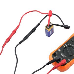 Double pince crocodile à double prise de la banane, qui peuvent être utilisés dans toutes les applications électriques et électroniques tels que les circuits électriques tests de travail, assemble et ainsi de suite. Proster Pince multimètre numérique TRMS 6 000 points, 800 A DC AC Courant AC/DC Tension NCV continuité capacité résistance fréquence diode Hz Test... Kit Sondes Test Proster 24 Pièces Pinces Crocodiles Pointes Dorées Kit Proster 24PCS Cordons Test Multimètre - Sondes Or, Crochets, Pinces Pinces Crocodiles Test électrique Longueur totale : 1 m/1 m., Courant nominal : 15 A Pinces Crocodiles Proster Cordons De Test Pour Multimètres 4mm Fiche Banane à Pince Pince Crocodile Multimetre Il comprend 2 câbles test de 3 pieds (CAT III 1000V), 8 embouts de sonde (nickel et or), 2 pinces crocodile, 2 crochets ressort, 2 fiches bananes, et un clip... Alligator clips sont entièrement isolés avec les bottes en plastique d'isolation couverts, de sorte qu'il est sûr à utiliser. Facile à installer et à utiliser.
