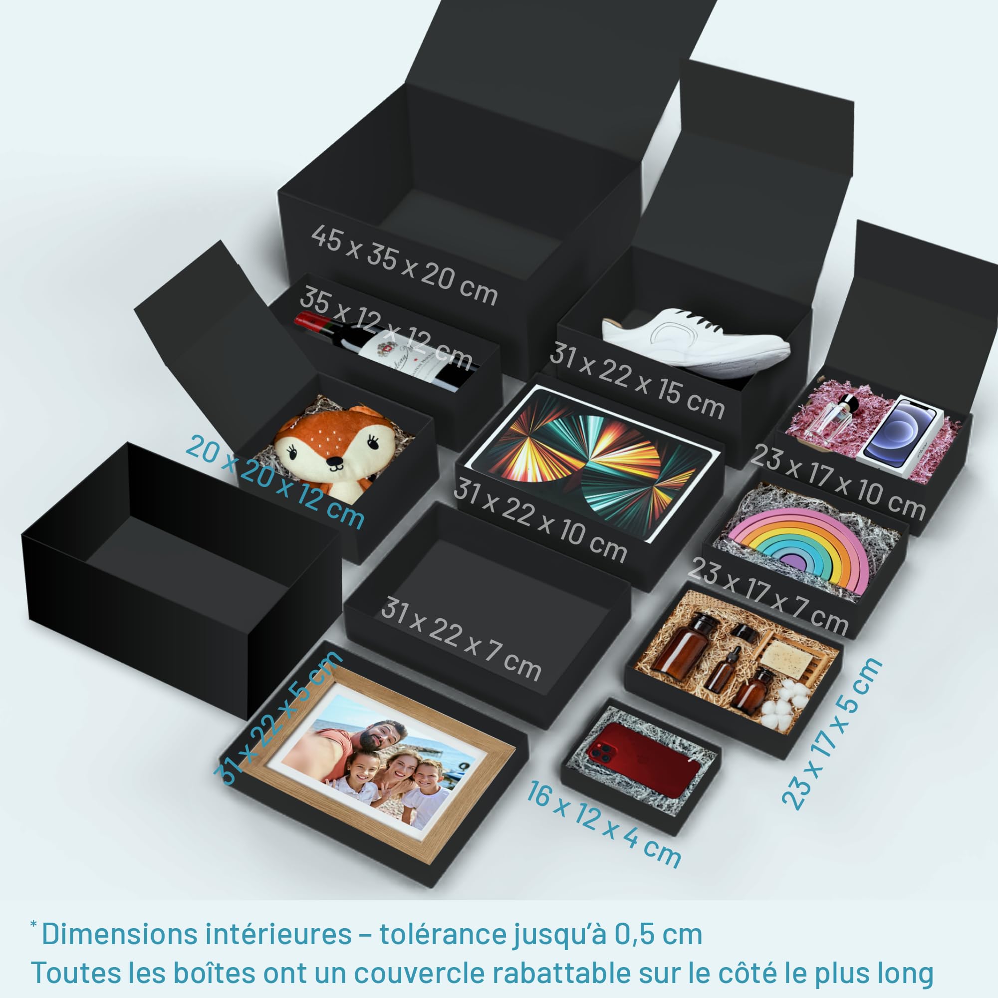 DESIGN ÉLÉGANT : Boîte Cadeau au style moderne et raffiné, idéale pour un anniversaire, un mariage, une naissance ou une pendaison de crémaillère. Coffret carton forme chalet BONNES FÊTES rouge/dorure à chaud or décor Sac Cadeau Grand Format Hianjoo Boîte Cadeau Avec Couvercle 23x17x7 Cm, Coffrets Cadeaux Pliables Avec Couvercle Magnétique Et Ruban Pour Mariages, Anniversaires, Saint-Valentin, Noël-Blanc Petite Boite Cadeau 12 Pcs Boîte En Carton, 9.1X9.2X2.9 Cm Coffret Cadeau En Papier Carré... DIMENSIONS IDÉALES : Avec ses 23 cm de long, 17 cm de large et 10 cm de haut, cette Boîte vide convient parfaitement aux cadeaux de petite à moyenne taille. Valorisante : large fenêtre PVC sur le dessus du coffret, laissant apparaitre le contenu. Elle valorise chaque présent avec élégance. Il suffit de retirer les bandes adhésives dans les coins, de la déplier, de presser légèrement, et elle est prête à l’emploi. MONTAGE FACILE : Livrée à plat, la Boîte se monte en quelques secondes. Belle finition : intérieur et extérieur de la même couleur pour une finition impeccable.