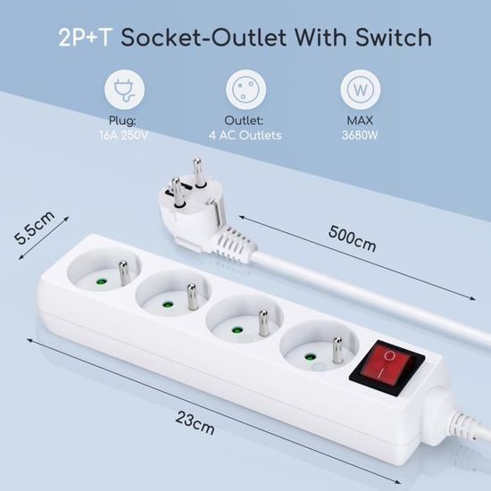 Gagnez en tranquillité d'esprit tout en chargeant vos appareils et appareils mobiles. 4 prises françaises CA avec mise à la terre - Boîtier ignifuge - Insertion à 45º - Grand espacement - Fil cuivre à trois conducteurs haute qualité - Grande conductivité, durable - Câble isolé sans déformation et extérieur en PVC - Sécurité enfant - 4 Allumez ou éteignez plusieurs appareils électroniques en appuyant sur l’interrupteur d’alimentation. Cube Prise Multiple Multiprise Parasurtenseurs Usb 5 Prises Avec 3 Ports Usb Chargeur De Rallonge Usb 3 Mètres 【Construction supérieure】 Nous adoptons un matériel anti-feu utilisant PP de haute qualité et une conception en cuivre standard, une résistance au feu résistante aux températures élevées et ignifuge pour éliminer les dangers cachés. Multiprise USB, Bloc Multiprise Electrique 10 Prises et 4 Ports USB... JSVER ultiprise Electrique USB,Bloc ultiprise 8 Prises(16A) avec 3 【Protection indépendante】Chaque prise dispose d'un dispositif de protection des enfants indépendant, totalement sans danger pour les enfants et prévenant les accidents et les risques d'électrocution. 【Contrôle à une touche】Un interrupteur marche / arrêt vous donne une garantie en toute sécurité.