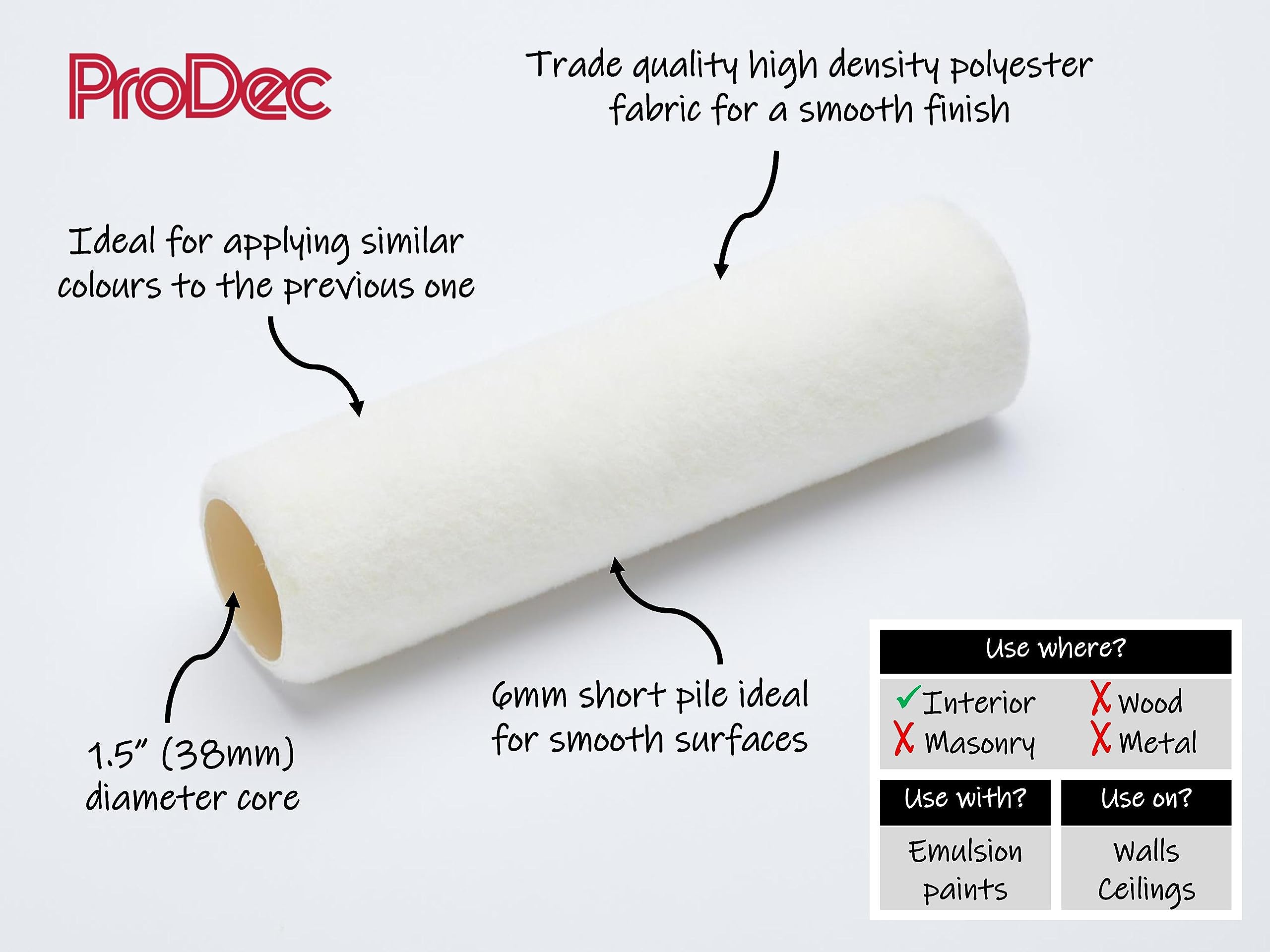 For gloss and satin paints, choose a shorter pile ProDec roller: either a specialist Gloss Pile or foam roller, or a shorter pile woven fabric like 6mm Short Pile Microfibre. ProDec is the UK's biggest and most widely distributed brand of trade decorating tools and accessories. ProDec Contractor Rouleau 225 Mm X 38 Mm Polyester Poils Longs It picks up plenty of paint, with smooth, even application for efficiency and good coverage to minimise the number of coats required., The 12mm (0., 5) medium pile is suitable for interior emulsion paints (eg. This roller is 9” (225mm) width, which is ideal for walls and ceilings., It has a 1., 75 (44mm) trade diameter core, so ensure you have a compatible 1., 75 diameter cage roller frame. Brosse rotative CRAFTSMAN rouge 6 po à poils moyens CMCPSMB matt, silk, eggshell) on smooth surfaces such as plaster, drywall and ceilings, and semi-smooth surfaces including light to medium textured plasters such as artex. Rouleau murs et plafonds 230 mm poils moyens - Brico Dépôt Convient aux surfaces lisses et semi-lisses Largeur de 225 mm x diamètre de 44 mm convenant aux murs intérieurs et aux plafonds (nécessite une monture de type cage d’un diamètre de 44 mm) For heavily textured masonry surfaces, consider using a longer pile woven roller such as ProDec's Long Pile or Heavy Duty rollers which are more durable. Rouleau professionnel 225 mm poils longs, noyau rembourré ultra... Nous vous proposons un choix varié d Rouleau en polyester haute densité de qualité professionnelle offrant un bon choix économique For best results the roller should be washed in cold or tepid water before first use to remove any loose fibres.