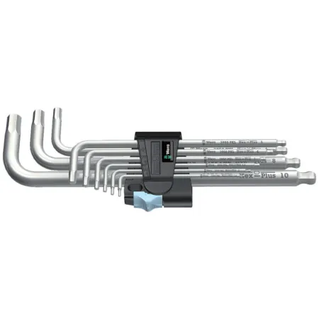 Le profil Hexa-Plus offre des surfaces d’appui plus vastes dans la tête de vis. Sous clip dédié, quasi inusable. Wera Hex-Plus tools have a larger contact surface in the screw head. The notching effects are reduced and thereby the deformation of the screws. At the same time, as much as 20 % more torque can be applied. Stainless L-keys: Stainless L-keys are hardened to the same strength as conventional (carbon) steel tools, and prevent extraenous rust forming Jeu 8 clés mâles coudées torx courtes > Boutique Beta... L’acier inoxydable évite la transmission de rouille erratique. En matériau très résistant pour une grande longévité Informations techniques Largeur: 97 Longueur: 246 Hauteur: 33 Wera 05073544001 Hex-Plus Stainless Steel L-Shaped Hex Wrench Set, 3950/9 SB, Mu Grâce à la dimension facilement repérable, les clés sont faciles à trouver Les clés mâles coudées en inox éviter la rouille sur les vis inox , Wera Wera Tools Wera 967 PKL/9 SB SiS TORX® Intérieur Jeu De Clés Mâles Coudées T 8, T Clé Mâle Clé mâle coudée avec gainage plastique en matériau rond facilitant la préhension. En plus de rendre le travail agréable, y compris à basses températures, ce gainage ménage les doigts. Hexa-Plus conférant une longévité supérieure aux vis à six pans creux
