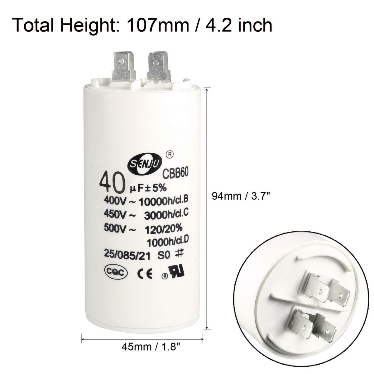 Convient pour démarrer et mieux travailler le moteur sur un réseau AC 50/60 Hz. Condensateur 40uf Acogedor , CBB60, Cylindrique, Polystyrène (PS), Capacitors, CAPACITOR, Moteur, 450V, 40µf, ESR 0,2, Démarreur, Électroménager, Environnemental, 50/60 Hz Condensateur Seche Linge Spécifications: Capacité nominale : 40 uf Tension nominale : 450 V., ESR : 0,2., Contenu : 1 condensateur. Spécialement conçu pour démarrer et faire fonctionner des moteurs monophasés AC; Solution polyvalente pour appareils à moteur. DESCRIPTION DU PRODUIT. 40Uf... CBB60A-40/450 SR PASSIVES - Condensateur: polypropylène | pour moteurs CONDENSATEUR MOTEUR 40 permanent de démarrage 450V 40uF 40µF 5% Ø48 x 93mm NEUF - EUR 15,90.À VENDRE! démarrage moteur 40MF 40µF 40uF 450V 10% a fils condo condensateur... Petite taille et poids léger pour un transport confortable. Largement utilisé dans de nombreux types d'appareils électroménagers.