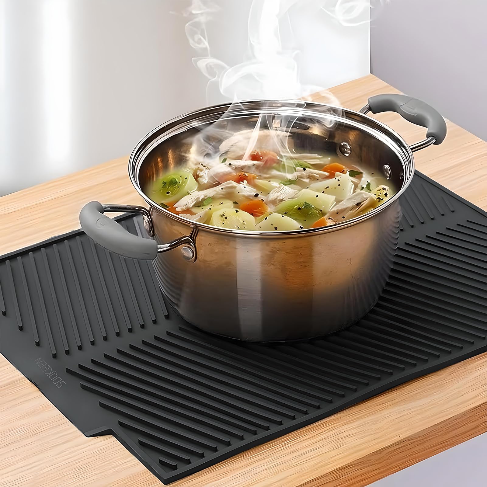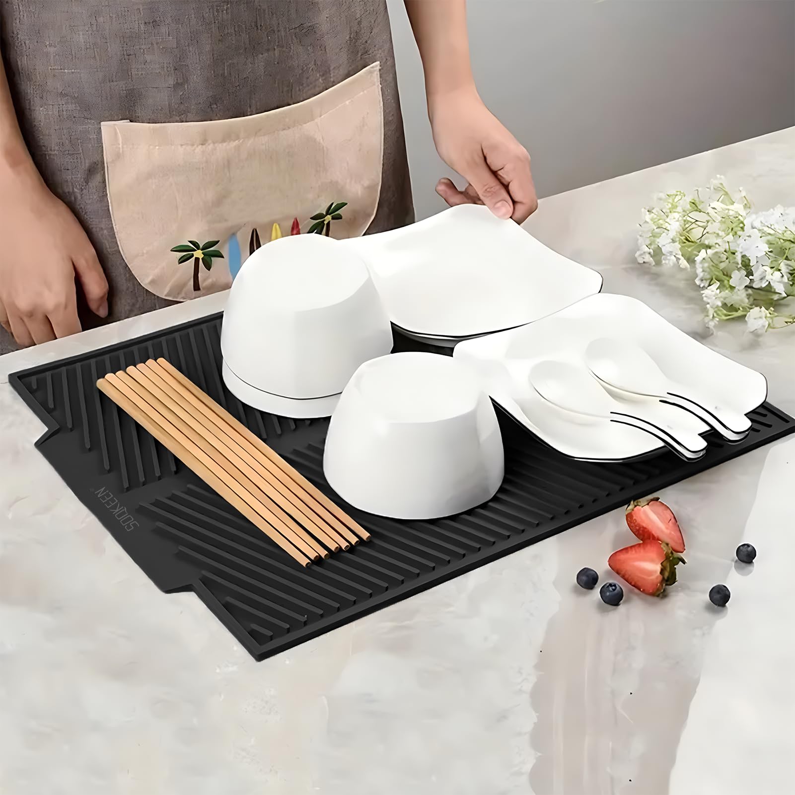 Dimensions : 50 cm x 40 cm Matériau : silicone alimentaire. Thinkingwings Tapis égouttoir en silicone pour comptoir de cuisine, résistant à la chaleur, facile à nettoyer, égouttoir antidérapant pour comptoir de cuisine (40,6 x 30,5 cm, noir Égouttoir à vaisselle - bac à égouttement pour vaisselle propre - avec... Facile à ranger : ce tapis d'égouttement est fabriqué en matériau très doux, il peut donc être facilement enroulé ou accroché avec un crochet, économisez de l'espace de stockage. Silicone de qualité alimentaire : le tapis d'égouttement ne contient pas de BPA, antibactérien et respectueux de l'environnement, de sorte que vous et votre famille avez de la vaisselle propre et sèche. Facile à enrouler ou à plier pour le rangement. Garantie d'achat : Si vous avez d'autres questions sur nos tapis de séchage de vaisselle, n'hésitez pas à nous contacter. Polyvalent : ce tapis d'égouttement peut être utilisé sur les comptoirs de cuisine ou les éviers de cuisine, comme revêtement de réfrigérateur ou de tiroir, tapis résistant à la chaleur, tapis antidérapant pour animaux de compagnie. Travail : Les tapis d'égouttement sont parfaits pour sécher la verrerie, les assiettes, les bols, les couverts, les casseroles, les poêles, les spatules, les couverts, etc. Il peut y avoir des taches d'eau pendant l'utilisation, mais si vous le lavez à l'eau, il redeviendra très propre Couleur : noir. Peigne ondulé. Léger et durable. Design étanche pour un nettoyage facile. Il peut y avoir des taches d'eau pendant l'utilisation, mais si vous le lavez à l'eau, il redeviendra très propre Thinkingwings Tapis D'égouttement En Silicone Respectueux De L 039 Environnement Avec le tapis d'égouttement, les possibilités sont infinies.