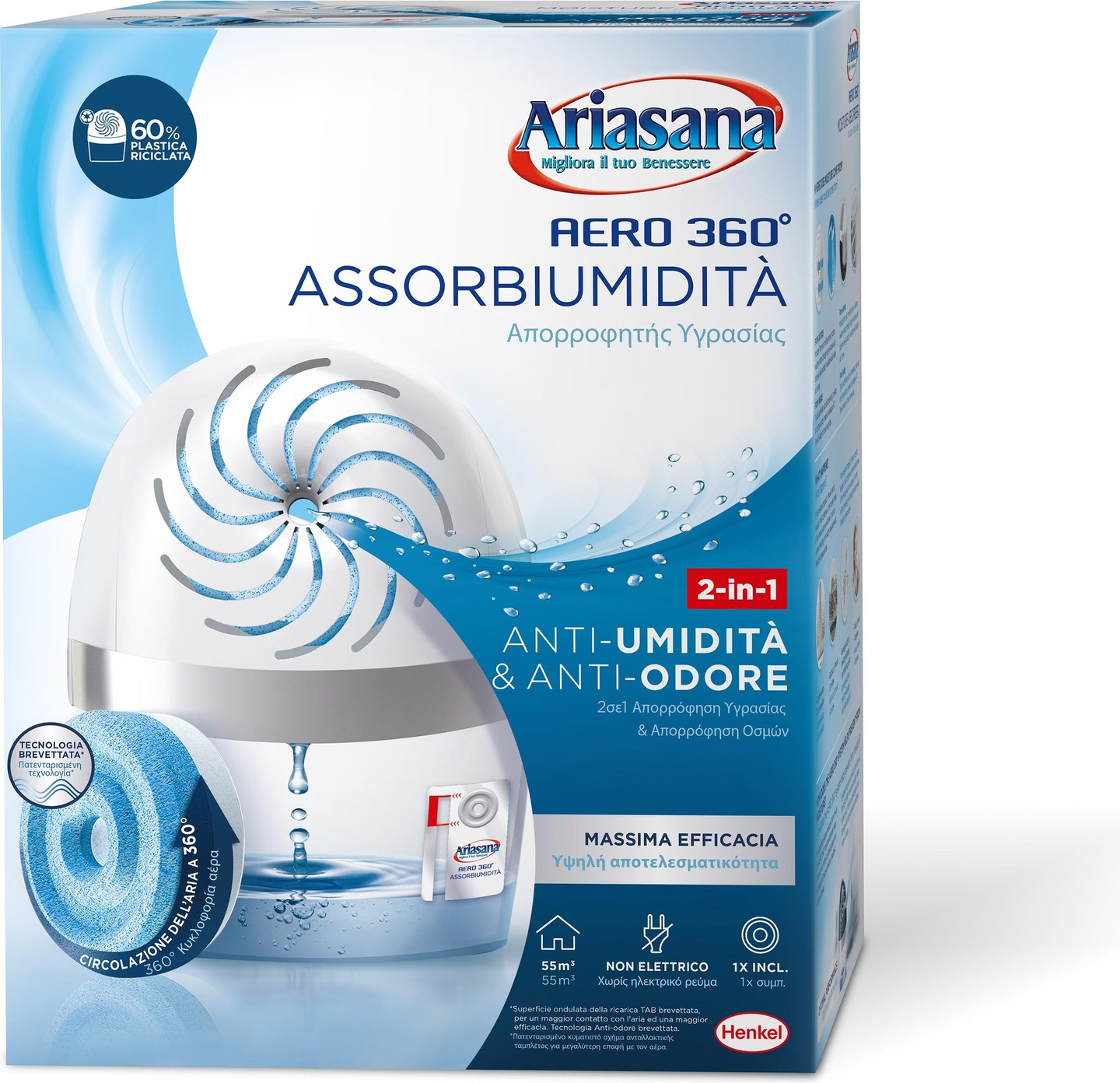 Rubson Recharges Pure Tab pour absorbeur d'humidité AERO 360° (4 x 450 g) – Recharges neutres anti-humidité & anti-odeur pour déshumidificateur Design rainuré breveté avec trou central. Prévient aussi bien les conséquences de l'humidité pour la maison (condensation, moisissure, mauvaises odeurs) que pour la famille (risque plus élevé d'infections, air non sain). Technologie 2 en 1 : cristaux ultra absorbants et agents anti-odeurs brevetés. Recharge Rubson Aero 360 Ariasana Aero 360 ° Kit Assorbiumidità, Deumidificatore Ricaricabile Non Elettri Recharge Aero 360 Répétez le processus avec une nouvelle tablette ; choisissez parmi les parfums disponibles de la gamme Aromathérapie, et créez l'atmosphère que vous préférez. <br/Contenu de l’emballage – Rubson AERO 360° Recharges Neutres, recharges ultra-absorbantes, lot de 4 x 450 g. Description du produit Ariasana Aero 360 ° TAB recharge inodore pour absorption de l'humidité en lot double – Offre une commodité jusqu'à 6 mois de durée de vie. Avantages du produit : Action active contre l'humidité et les mauvaises odeurs. Idéal pour des pièces jusqu'à 55 m3 Emballage : 2 TAB de 450 g inodore *En fonction de la température et du degré d'humidité de la pièce Avertissement De Sûreté Usage extérieur uniquement. Aero 360° Recharges En Tabs Neutres Pour Absorbeur D'Humidité, 2 X 450... ARIASANA Aero 360° Tab absorbeur d'odeur neutre en lot de 2 recharges 450 g., 2025085 Henkel Elle évite les problèmes d'humidité et les odeurs de renfermé. Dure jusqu'à 3 mois. Tenir à l'écart de la flamme nue directe ou de la source de chaleur. Lorsque la pastille sera dissoute, ouvrez le bec verseur et versez la solution saline dans les toilettes. Contrôle de l'humidité & des odeurs – L'absorbeur d'odeurs AERO 360° et ses recharges offrent une solution efficace pour absorber l'humidité et neutraliser les mauvaises odeurs dans votre maison. Les recharges Tab ultra-absorbantes sont parfaites pour le kit Ariasana Aero 360 °, pour vous assurer un contrôle de l'humidité efficace et de longue durée Le système innovant de circulation de l'air à 360° garantit une meilleure absorption de l'humidité, pour créer un environnement agréable.