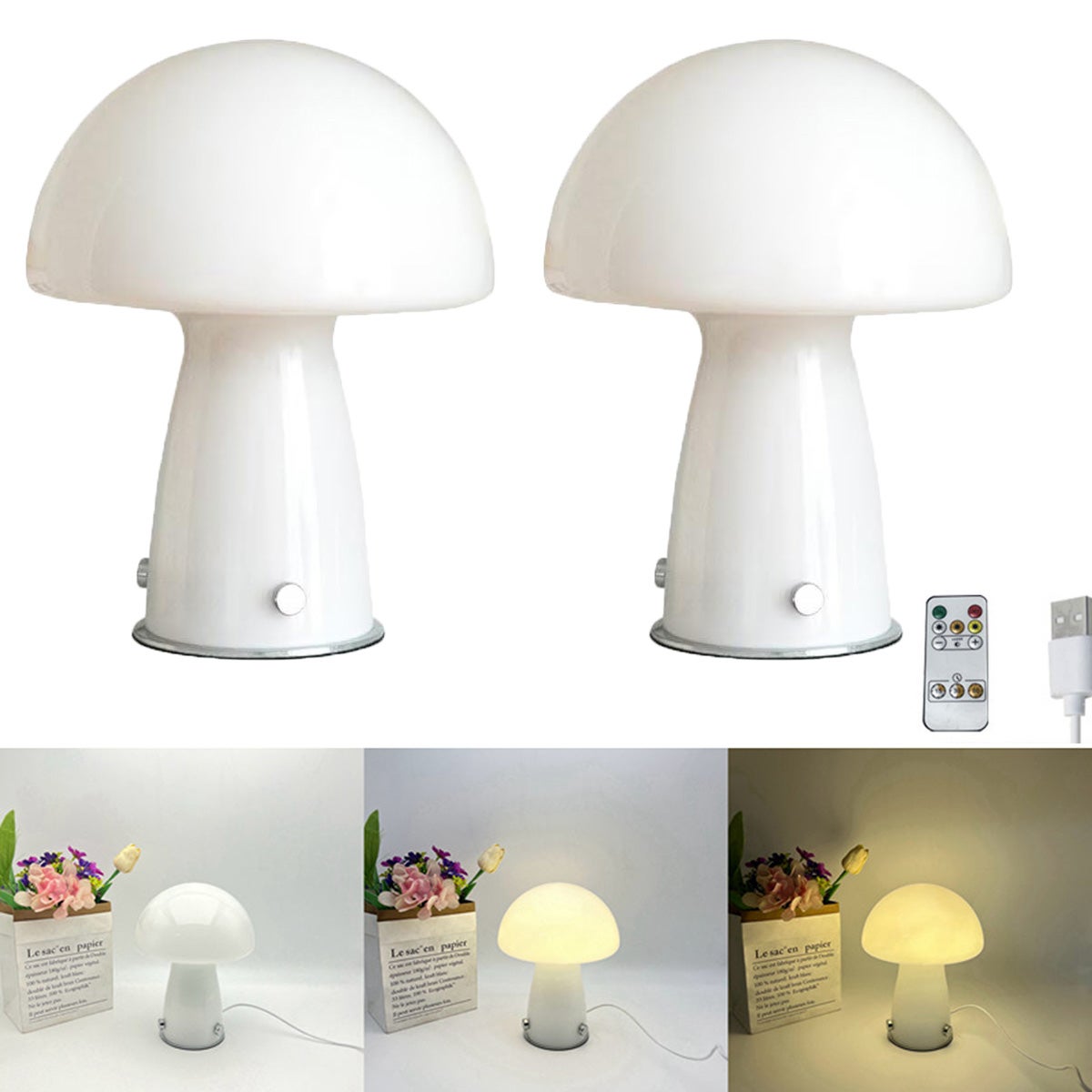 Lampe de table rechargeable en forme de champignon à intensité variable avec 3 températures de couleur Caractéristiques : Matériau : verre céramique., Tension nominale : 5 V., Dimensions : 19 x 14 cm. Que ce soit pour lire, se détendre ou créer une atmosphère, il peut répondre à vos besoins et laisser la lumière devenir la palette de votre humeur. Que ce soit pour des vacances, un anniversaire ou une occasion spéciale, c'est un cadeau parfait pour les parents et les amis, montrant votre attention et votre goût. Lampe En Forme De Champignon BestAlice Lampe Champignon, Veilleuse Champignon En Verre, Rechargeable Par USB, Trois Couleurs, Intensité Variable, Petite Lampe De Chevet à Rayures, Style Vintage (télécommande Rose Lampe Champignon Malampe 【Design unique, ajoutant du charme intérieur】Cette lampe de chevet apporte un style unique de Murano à votre chambre avec son abat-jour en verre soufflé à la main et son design unique en forme de champignon. Utilisation multifonctionnelle, excellent cadeau : cette lampe de table champignon est non seulement adaptée pour la chambre, mais peut également être utilisée comme lampe décorative pour de nombreuses occasions telles que les buffets, les salons, les crèches, les salles d'étude, les restaurants, etc. Que ce soit comme lampe de chevet ou veilleuse décorative, son design coloré à pois peut créer une atmosphère confortable et agréable, ce qui en fait un choix idéal pour n'importe quel espace. Vous pouvez l'utiliser directement sans paramètres supplémentaires, apportant plus de commodité à votre vie. La télécommande dispose d'une fonction de minuterie avec des fonctions de minuterie de 15, 30 et 60 minutes. Lot de 2 lampes de table champignon à LED en verre, trois températures... Température de couleur : lumière blanche froide, lumière naturelle et lumière chaude., Variation : gradation continue.