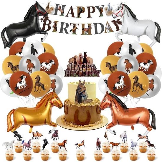 Au galop pour un anniversaire équestre Le bonheur pour les fans de chevaux et poneys ! Pas de doute, vous avez bien galopé jusqu'au bon endroit ! L'écurie vous réserve tout ce qu'il faut pour réaliser une décoration d'anniversaire sur le thème Cheval qui cartonnera à coup sûr Caractéristiques : Matériau : carton biodégradable et latex., Couleur : voir photo., Dimensions : voir photo. Lot de 12 décorations de gâteau avec rampe de cheval. Fangleland Kit de décorations de fête d'anniversaire cheval pour Anniversaire Chevaux Décoration Kit Décorations D'anniversaire Autour Du Cheval - Hobby Horse World Décoration Anniversaire équestre Le ballon est fabriqué en latex de haute qualité, il ne contient pas d'additifs chimiques et est inoffensif pour les enfants et les adultes. Chaque ballon est imprimé avec un beau cheval, plein de surprises et d'innocence enfantine qui apportera une atmosphère de fête joyeuse à votre fête et créera des souvenirs inoubliables. Il est sûr à utiliser. 1 bannière Happy Birthday, 16 ballons en latex, 1 grande décoration de gâteau d'anniversaire et 12 décorations de gâteau avec troupe de chevaux Conseils : Décoration uniquement, non comestible, ne pas utiliser au four ou au micro-ondes, laisser refroidir les cupcakes. Décorations de fête sur le thème du cheval : Si vous cherchez des idées originales pour l’anniversaire de votre enfant, cet ensemble de fournitures Cowboy Horse est exactement ce qu’il vous faut. Les assiettes, tasses et la bannière « Joyeux Anniversaire » arborent de magnifiques motifs de chevaux , conçus pour captiver l’attention de tous. Les éléments uniques inspirés de l... 1 grande décoration de gâteau d'anniversaire.