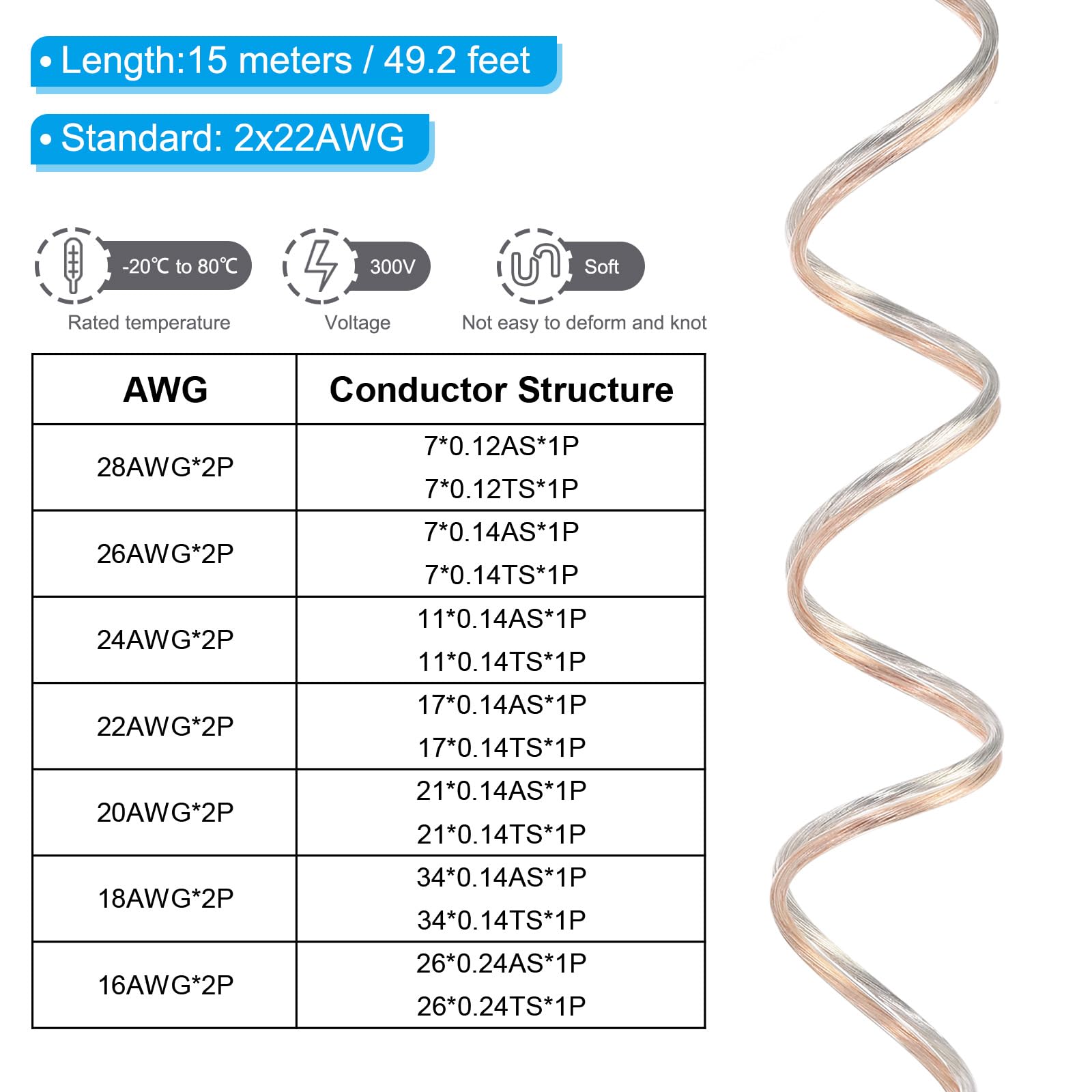 Ce câble flexible en PVC est fabriqué en fil de cuivre pure et offre une excellente conductivité et une transmission électrique stable. Spécifications : Certification : Homologué UL ; Matériau : PVC, Cuivre ; Couleur : Ton cuivre argenté ; Câble d'alimentation : 2x26AWG ; Tension : 300V ; Température de travail : -20℃ à 80℃ ; Diamètre intérieur du noyau : 26AWG (7*0,14mm) ; Diamètre extérieur du fil : 1,3 x 2,6 mm/0,05 x 0,1 pouces ; Longueur du câble : 15 mètres/49,2 pieds ; Liste d'emballage : 1 rouleau de fil enveloppé de PVC. Spécifications :Certification : Homologué ULMatériau : PVC, CuivreCouleur : Transparent, Argent, MarronCâble d'alimentation : 2x26AWGTension : 300VTempérature nominale : -20℃ à 80℃Diamètre intérieur du noyau : 26AWG (7*0,14mm)Diamètre extérieur du fil : 1,3 x 2,6 mm/0,05 x 0,1 poucesLongueur du câble : 15 mètres/49,2 piedsListe d'emballage : 1 rouleau de fil enveloppé de PVCAvantages :Certifié UL2468, fil de cuivre étamé transparent, avec une résistance plus faible et une conductivité plus élevée, facile à connecter et à câbler de manière flexible ; le fil supporte une tension de 300V, garantissant un fonctionnement sûr et fiable. Retrouvez ci-après nos 2464 offres, marques, références et promotions en stock prêtes à être livrées rapidement dans nos magasins les plus proches de chez vous Plaid Chauffant Sans Fil 3 Niveaux De Chaleur,150 X 80 Cm, Portable... PATIKIL Fil De Cuivre Recouvert De PVC De 10 M, 26/2, 300 V, Câble De L'extérieur du fil est en PVC transparent, ignifuge, résistant à l'usure, à l'oxydation et à la corrosion, ne s'emmêle pas facilement et est très flexible. PATIKIL Fil de cuivre recouvert de PVC de 60 m, câble de haut-parleur Avantages : Certifié UL2468, fil de cuivre étamé transparent, avec une résistance plus faible et une conductivité plus élevée, facile à connecter et à câbler de manière flexible ; le fil supporte une tension de 300V, garantissant un fonctionnement sûr et fiable. Fabriqué en PVC de bonne qualité, il offre une bonne isolation, n'est pas facile à casser, est souple et ne s'emmêle pas facilement, et est durable. Fabriqué en PVC de qualité, il offre une bonne isolation, n'est pas facile à casser, est souple et ne s'emmêle pas facilement, et est durable., Instructions : 1., Facile à utiliser, coupez à la longueur souhaitée., 2., Vous pouvez ensuite couper le PVC à l'extrémité du fil pour exposer le noyau en cuivre., 3., Câblage et connexion.