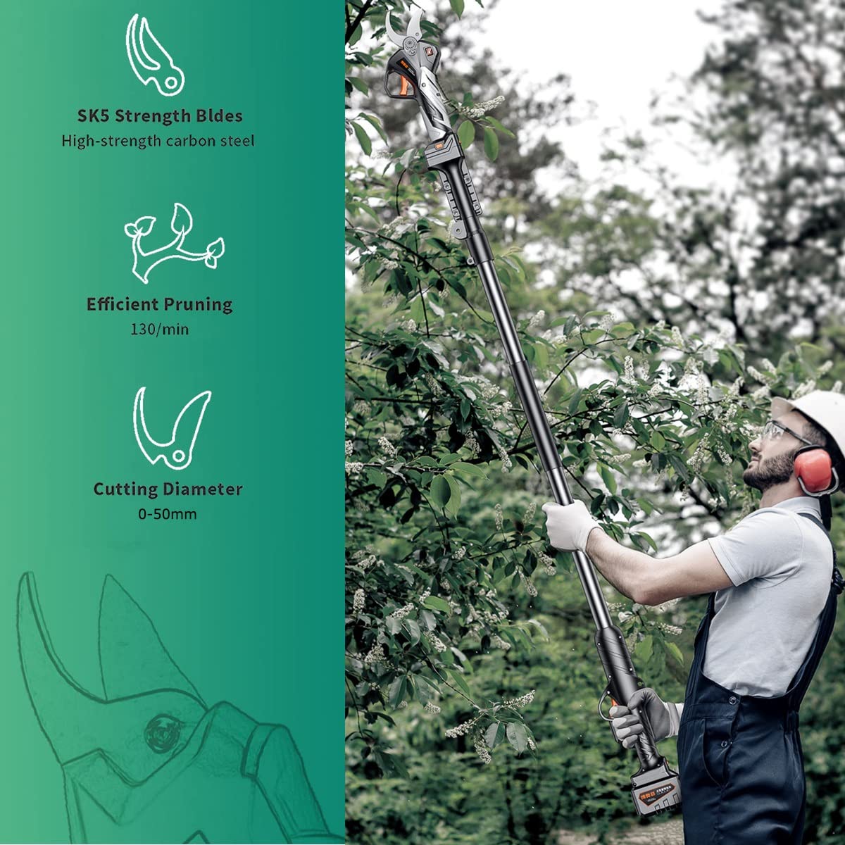 【Deux Batteries Pour Une Utilisation Quotidienne】Ce sécateur électrique est équipé de deux batteries rechargeables 21V 4,5 Ah (autonomie de 8-12 h) avec charge rapide (1-2h). 【Perche D'extension Réglable】Ce sécateur électrique longue portée s'étend de 1,3 à 2,1 m (4,3 à 6,9 pieds) et permet de tailler des branches hautes (jusqu'à 5 m) sans échelle. Sécateur Électrique Sans Fil PRUMYA 1000W 50mm Affichage LED avec 2 Sa poignée ergonomique antidérapante réduit la fatigue des mains, idéale pour la taille des arbustes ou des arbres. ● Autonomie d'une journée : 2 batteries (8 à 12 heures au total) pour les gros travaux. Idéal pour travailler dans le verger ou à la ferme, sans interruption. Idéal pour les arboristes, les agriculteurs ou les particuliers, il coupe des branches épaisses (jusqu'à 50 mm de diamètre) ou hautes (avec perche télescopique). Il est doté d'un mécanisme de verrouillage sécurisé qui empêche toute ouverture ou fermeture accidentelle. L'écran LED affiche les coupes effectuées et le niveau de batterie, vous permettant de surveiller l'efficacité. Sécateur télescopique sans fil BOSCH AdvancedPrune 18V L.1,8m 45mm 1... 【Utilisation Sans Fil Et Multi-scènes】Léger (0,8 kg). Secateur Electrique Sécateur Électrique Sans Fil Avec Perche Télescopique Secateur Electrique Avec Batterie ● Polyvalent : Pour tailler avec précision haies, buissons, vergers et autres espaces verts. Pourquoi Choisir Ce Sécateur ?● Taille efficace : Coupez facilement des branches jusqu'à 50 mm de diamètre avec un sécateur électrique. Conseil : chargez complètement avant la première utilisation. ● Perches extensibles : Rétractables de 1,3 à 2,1 m, pour une taille facile des branches jusqu'à 5 m de haut. Il est idéal pour les jardins, les fermes, les vergers, les serres et les maisons.