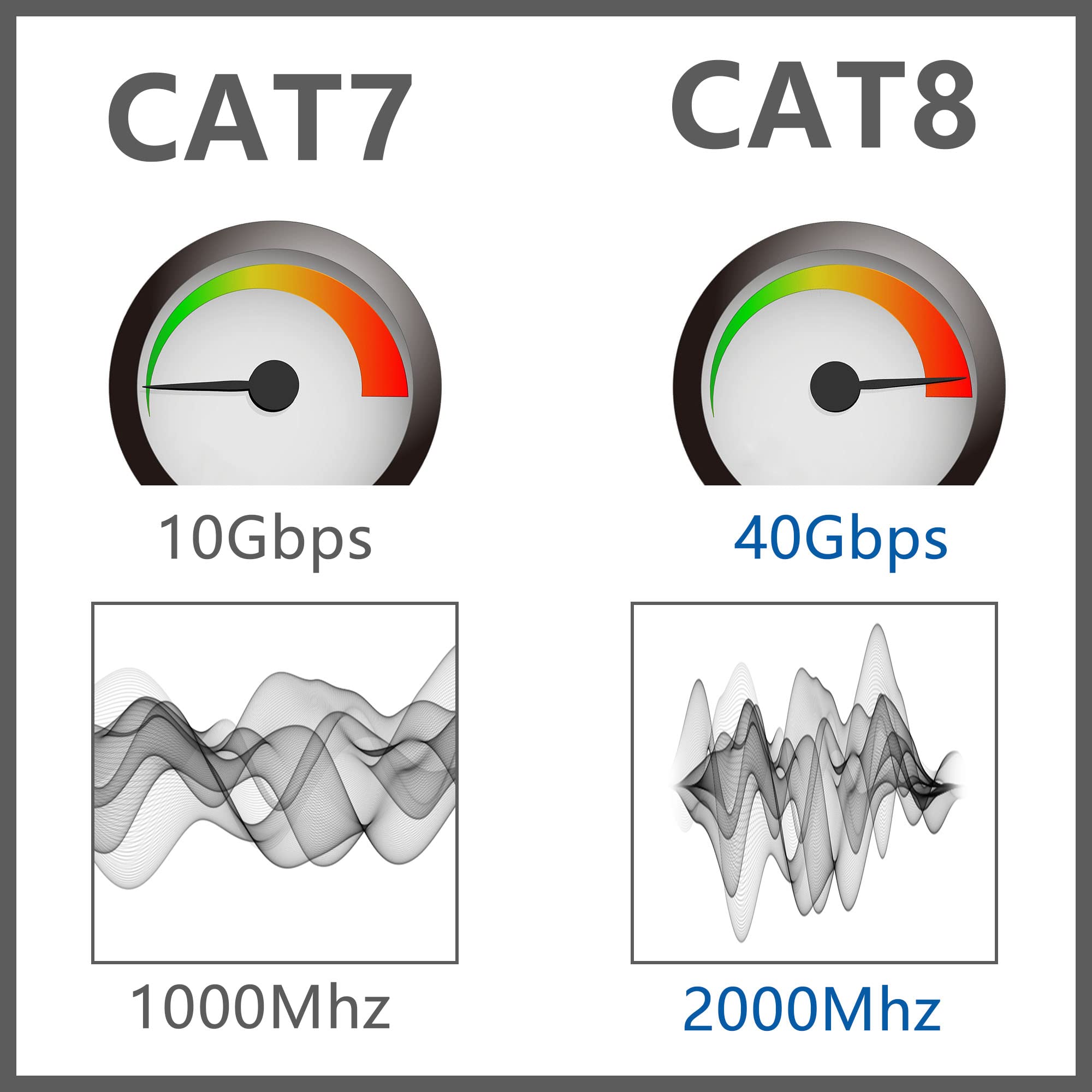 Cable Ethernet Cat 8 SinLoon Câble Ethernet RJ45 Cat8, Mâle Vers Mâle, Câble Rése Plumeau Telescopique Couramment utilisé dans la connexion entre ordinateurs, téléviseurs Internet, chats haut débit, concentrateurs de câble, commutateurs, décodeurs numériques réseau, imprimantes et autres équipements Remarque : La vitesse de votre réseau est déterminée par de nombreux facteurs qui incluent le câble, votre routeur, les boîtiers de commutation, d'autres composants de réseau et également le fournisseur de services Internet. Câble Ethernet haut débit : câble réseau CAT 8 à paire torsadée de précision vitesse de transmission de données jusqu'à 40 Gbit/s, prend en charge une bande passante de 2000 MHz Câble Ethernet Cat8 5m, 40 Gbps 2000MHz LAN Gigabit RJ45 plaqué or, câble de raccordement plat Marque: Vention · Modèle:IKI · Couleur: Noir · Interface: RJ45 · Taux de transmission: 40 Gbit/s · Bande passante: 2000 MHz · Matériau conducteur: Cuivre pur... Le design blindé protège contre les interférences électromagnétiques et les RFI. 【Forte compatibilité】: le câble Ethernet Cat8 est adapté à tous les périphériques d'interface de câble réseau, et est souvent utilisé pour la connexion entre ordinateurs, téléviseurs réseau, modems haut débit, concentrateurs, commutateurs, décodeurs réseau numériques, imprimantes et autres appareils Maintenir une vitesse Internet stable. Plus stable : le câble réseau Cat 8 adopte des connecteurs RJ45 plaqués or aux deux extrémités, ce qui peut améliorer la conductivité du câble réseau et résister à l'oxydation. Excellente anti-interférences : le câble Ethernet Cat8 est fabriqué avec 4 paires torsadées blindées (STP) et un fil OFC monobrin (32 AWG), qui blindé Cat8 et améliore la qualité de la paire torsadée, le Cat8 peut réduire entièrement tout niveau d'interférences de signal. Livré chez vous au meilleur prix : SinLoon Câble Ethernet RJ45 Cat8, câble réseau haute vitesse 90 degrés mâle vers mâle Cat8, 40 Gbit/s 2000 MHz SFTP pour rout Câble Ethernet Cat8 mâle vers 90 degrés : changez l'angle du connecteur RJ45 pour un placement plus facile dans certains espaces étroits