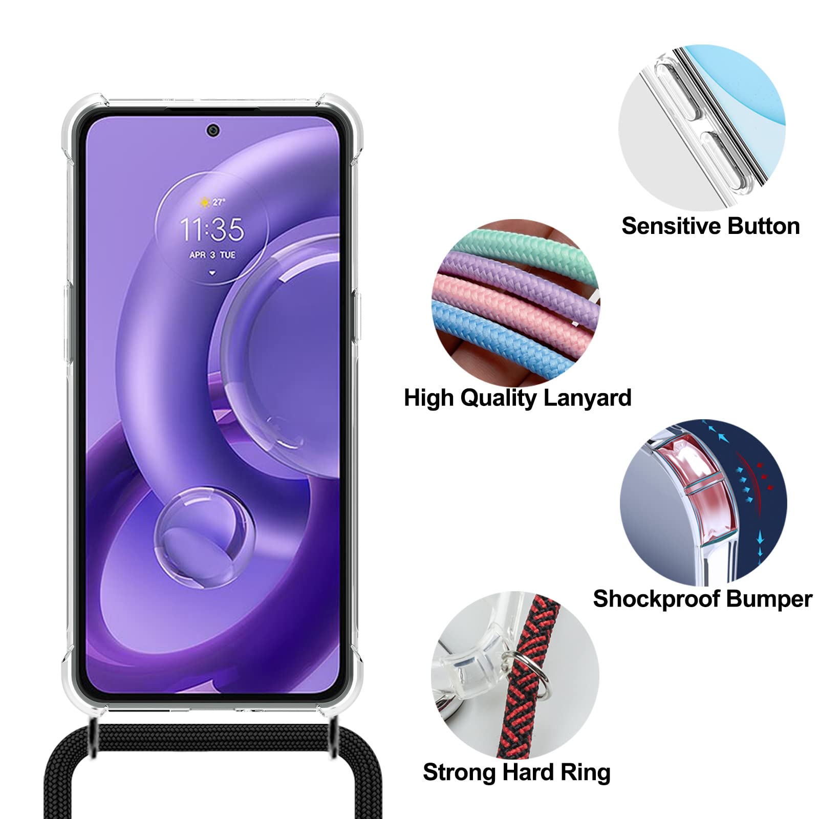 Protection contre le vol, No poches bombées, Longueur réglable Doux, léger, facile à installer et à enlever, et n’endommagera pas le téléphone. Coque Silicone transparente pour Motorola Edge 30 Neo Ajustez avec le cordon comme vous le souhaitez et ajustez la bande exactement pour vous, La chaîne de téléphonie mobile a un cordon d’environ 150 cm (diamètre d’environ 7mm). La bande mesure environ 1,5 m (150 cm) de long et la longueur est réglable pour n’importe quelle taille de corps. No recherche éternelle dans des sacs à dos ou des sacs Poche de téléphone portable pour accrocher! 【Boucle détachable】Facile à l’installer et à l’enlever ; fonctionne également avec d’autres accessoires portables : carte d'identité, badge, porte-clés, portefeuille, etc. Chaîne de téléphonie mobile étui de téléphone portable : Smartphone toujours à portée de main La coque est conçue pour garantir la protection maximale de votre téléphone portable grâce à son design. Profitez de la protection et de la résistance de votre coque qui est faite de Silicone souple, avec la partie arrière recouverte, C'est un design fin et ultra-léger, qui n'ajoute donc pas de volume ou de poids à la coque de votre... 【Matériau de haute qualité】Le cordon léger et doux en silicone permet de vous sentir confortable à porter toute la journée même sur les peaux nues ; n’absorbe pas la transpiration ou les odeurs, convenable pour le sport et les activités de plein air. Coque Motorola Edge 30 Neo YAMCCCSE Coque Pour Motorola Moto G34 5G Avec Cordon De Collier Cover Transparente Silicone Tpu Bumper Coque Moto Edge 30 Neo YAMCCCSE Robuste et durable, étui de téléphone Accessoire moderne et élégant! Pour chaque situation de la vie, que ce soit le travail, les loisirs, les sports, le shopping, la fête ou le festival. Notre pendentif de téléphone portable offre une sécurité maximale grâce à l’étui en silicone avec protection de bord, protège votre smartphone en cas de chute ou de coup. Le cordon de téléphone portable est livré avec un étui de téléphone portable auquel il est attaché. 【Longueur réglable】Le cordon élastique en silicone avec une excellente flexibilité peut s’étendre jusqu’à 150 cm.