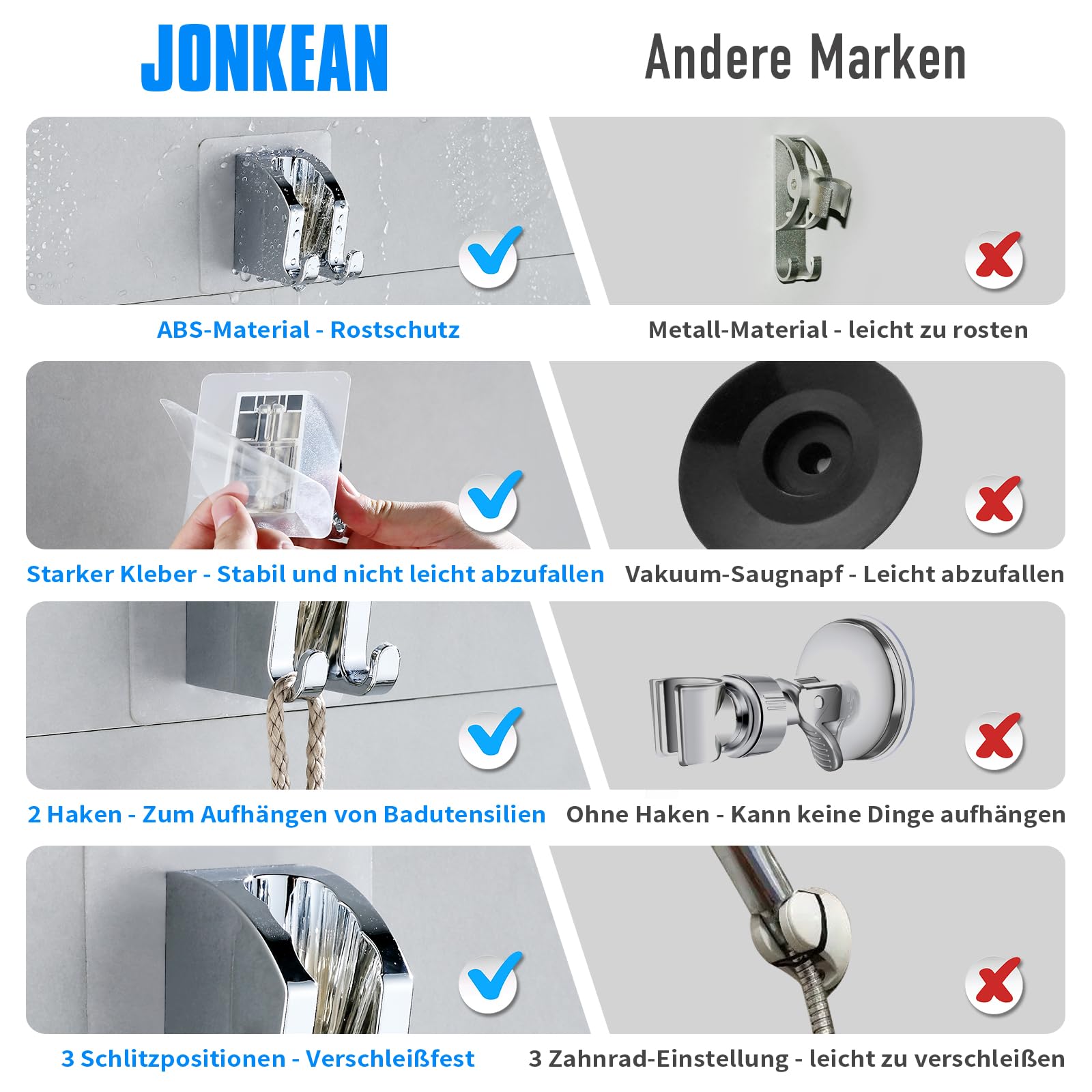Il est adapté aux pommeaux de douche standard G1/2. Cela vous aide à économiser plus d'espace et rend le stockage plus pratique et plus efficace. Les 2 crochets en bas peuvent être utilisés pour accrocher des accessoires de salle de bain et vous aider à économiser plus d'espace. Adhésif puissant et réglable : nos supports de pommeau de douche réglables sont fabriqués en adhésif haute résistance qui peut être fixé fermement sur des murs lisses sans tomber. Remarque : notre pommeau de douche sans perçage convient uniquement aux raccords de tuyaux métalliques élargis, pas aux raccords de tuyaux en plastique élargis. Avez-vous des difficultés à fixer le pommeau de douche dans une position adaptée à la taille de votre enfant ? Vous en avez assez d'utiliser un support de pommeau de douche normal ? Vous en avez assez de percer des trous dans les murs ou les carreaux pour installer le support de douchette ? Venez, notre support de douchette sans perçage peut facilement résoudre votre problème., !, 1., Peut être installé à n'importe quelle hauteur souhaitée. Forte capacité de charge ●Grâce à la force super-adhésive de la colle 3M, la capacité de charge du support de douche est super forte Supports autocollants pour pommeau de douche sans perçage. Ne le placez pas sur des carreaux texturés, des carreaux concaves, du verre dépoli ou du bois rugueux, sinon l'adhésif ne fonctionnera pas bien et le support ne collera pas fermement., 3., Pour régler l'angle du support de douche de douche, vous devez d'abord insérer le pommeau de douche dans la fente du support afin qu'il puisse être ajusté. Large application : le support de pommeau de douche autocollant convient à la plupart des surfaces lisses, telles que le marbre lisse, les carreaux plats, le verre lisse et les surfaces métalliques. Support de douche sans perçage Colle 3M - Support de pommeau de douche Installation facile : installation autocollante, facile à installer en quelques minutes ; pour assurer sa stabilité et sa fiabilité, veuillez attendre 24 heures avant de mettre la douche. Support Pommeau De Douche Support Douche Sans Perçage Colle Réglable À... Matériau avancé : ce support de douchette sans perçage est fabriqué en matériau ABS imperméable de haute qualité, léger, résistant aux hautes températures, pas de rouille qui a une longue durée de vie. Cependant, il ne convient pas pour d'autres surfaces inégales telles que le ciment calcaire, les cloisons sèches rugueuses, irrégulières, fragiles ou texturées. (Si vous avez un grand pommeau de douche, il est recommandé de mesurer la taille de l'interface avant l'achat). Support Pommeau De Douche Sans Percage JONKEAN Support De Pommeau De Douche Sans Perçage, Adhésif De Accroche Pommeau De Douche L'angle du support JONKEAN pour pommeau de douche peut être réglé de 10° vers le haut et 40° vers le bas.