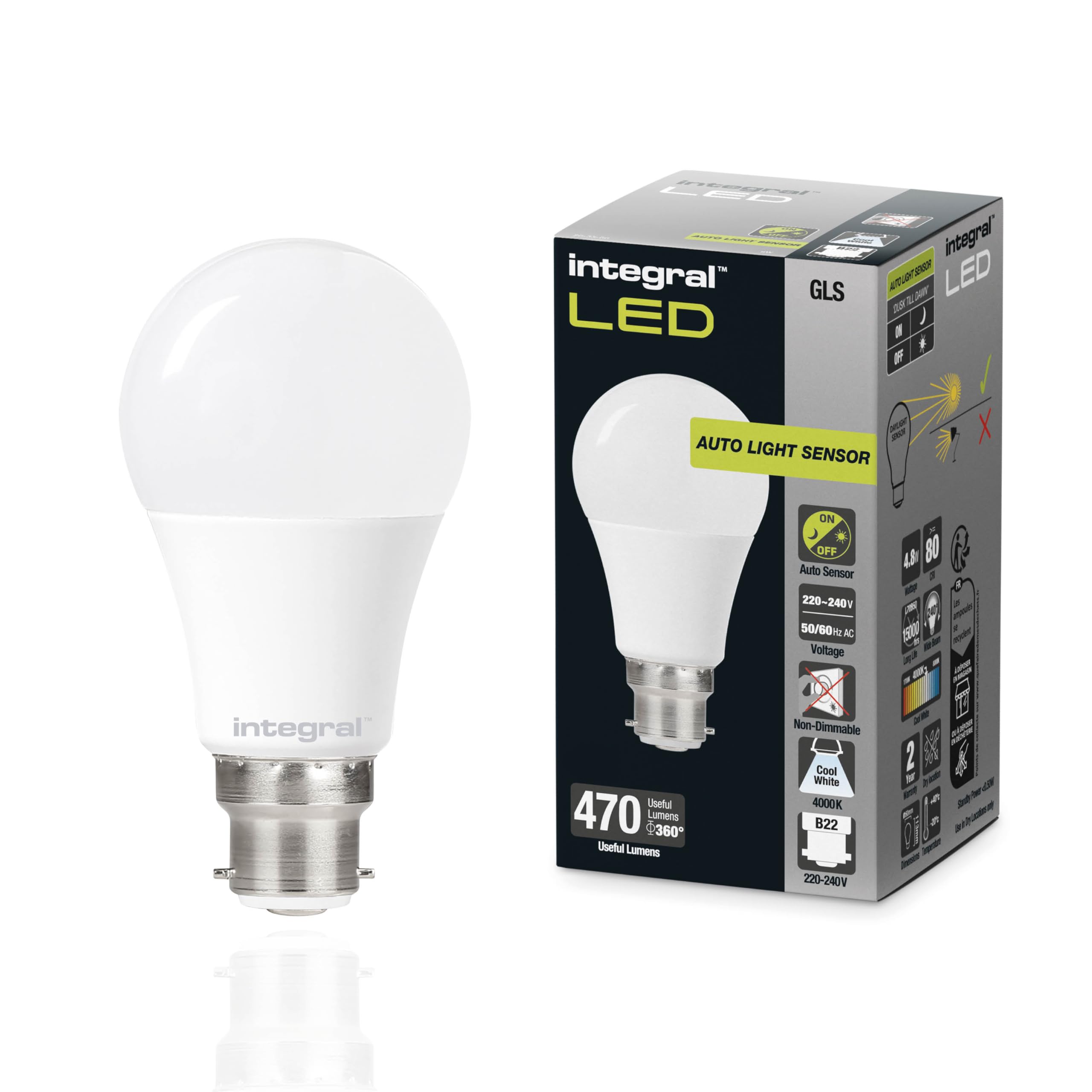 Integral Ampoule LED GLS B22 non-dimmable à double capteur crépusculaire - Blanc froid 4000K, 470lm, 4,8W (équivalent 40W) - Basse consommation et idéale pour l'extérieur Ampoule basse consommation – Trouvez le meilleur prix Ces capteurs photoélectriques permettent une détection précise, complète et stable de la lumière du soleil. Excellente capacité à différencier avec précision la... Efficace sur le plan énergétique : Les capteurs de lumière du jour et la fonction d'allumage et d'extinction automatique vous permettent d'économiser de l'argent tout en éclairant efficacement vos jardins et vos allées. Éclairez vos espaces extérieurs : Adaptées aux luminaires B22 BC (Bayonet Cap) de classe IP65 et supérieure, nos ampoules GLS contribuent à éclairer vos espaces extérieurs. Produits LED primés : Testée selon les normes les plus strictes dans notre laboratoire d'éclairage européen. Elles sont dotées de deux capteurs qui détectent la lumière du jour à 360° et s'allument et s'éteignent automatiquement au crépuscule et à l'aube. Économisez plus de 85 % sur vos factures d'énergie par rapport aux lampes halogènes équivalentes. Installation facile : Pas besoin de programmation. L'ampoule dépolie assure l'uniformité de l'éclairage, ce qui est agréable à l'œil. Un éclairage accueillant : La lumière blanche oide (4000K) crée une atmosphère lumineuse et stimulante. L'ampoule dépolie assure l'uniformité de l'éclairage... INTEGRAL LED Ampoule Décorative G80 B22 2,5 W équivalent à 40 W - Maison Durée de vie de 15 000 heures., Garantie de 2 ans