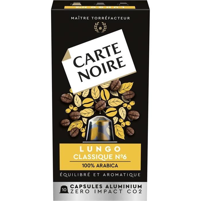 A utiliser avec les machines à café Nespresso Café Capsules Compatibles Nespresso Expresso Classique 7 Carte Noire... Mode d'emploi Placer la capsule dans la machine. Description du produit Carte Noire Espresso Classique N°7 : Café torréfié moulu en capsules, un café pur arabica avec des notes chocolatées et d’agrumes. Nespresso Machine A Café Carte Noire Café Espresso Classique N°7 Capsules Compatibles Nespresso Compatible Espresso classique intensité n°7, boite de 30 capsules, compatible avec machine nespresso original, Carte Noire Nos Maîtres Torréfacteurs révèlent les arômes de chacun des grains sélectionnés pour créer l'accord parfait Commandez maintenant et recevez vos coursess en moins de 24 heures directement chez vous Les indications ci-dessus sont données à titre d'information. 10 Paquets de 10 capsules monodoses de café moulu. Le café Espresso Classique n°7 a tout d’un grand café de caractère. Il est relativement intense et se laisse déguster très simplement grâce à son système en capsules compatibles Nespresso. Il possède des notes subtiles de cacao que vous découvrirez en arrière-goût à chaque gorgée. De plus, grâce à sa composition de grains 100% d’arabica, il se muni... Voir la liste complète sur Grâce à notre système de vente en gros, il est possible d’acheter vos capsules de café moins chères que si vous les achetiez au détail. Nous vous proposons des paquets de 50 capsules et de 100 capsules. Notre système vous permet d’acheter de plus grandes quantités de café et toujours au meilleur prix. Enfin, vous économiserez aussi sur le prix de l... Voir la liste complète sur Afin de déguster au mieux votre café N°7 Espresso Classique, nous vous recommandons de jeter un œil à notre catégorie gourmandise. Nous vous avons sélectionné les produits les plus délicieux pour passer une pause-café dans les meilleures conditions. Voir la liste complète sur A utiliser avec les machines à café Nespresso. Café torréfié moulu en capsules, un café pur arabica avec des notes chocolatées et d’agrumes Elles ne sont pas forcément exhaustives et ne sauraient se substituer aux informations figurant sur l'emballage du produit qui font seules foi, et auxquelles vous êtes invités à vous reporter, notamment en cas d'intolérance alimentaire. Café Espresso Pur Arabica, Rond et Equilibré, Intensité 7 Paquet de 30 capsules monodoses de café moulu.