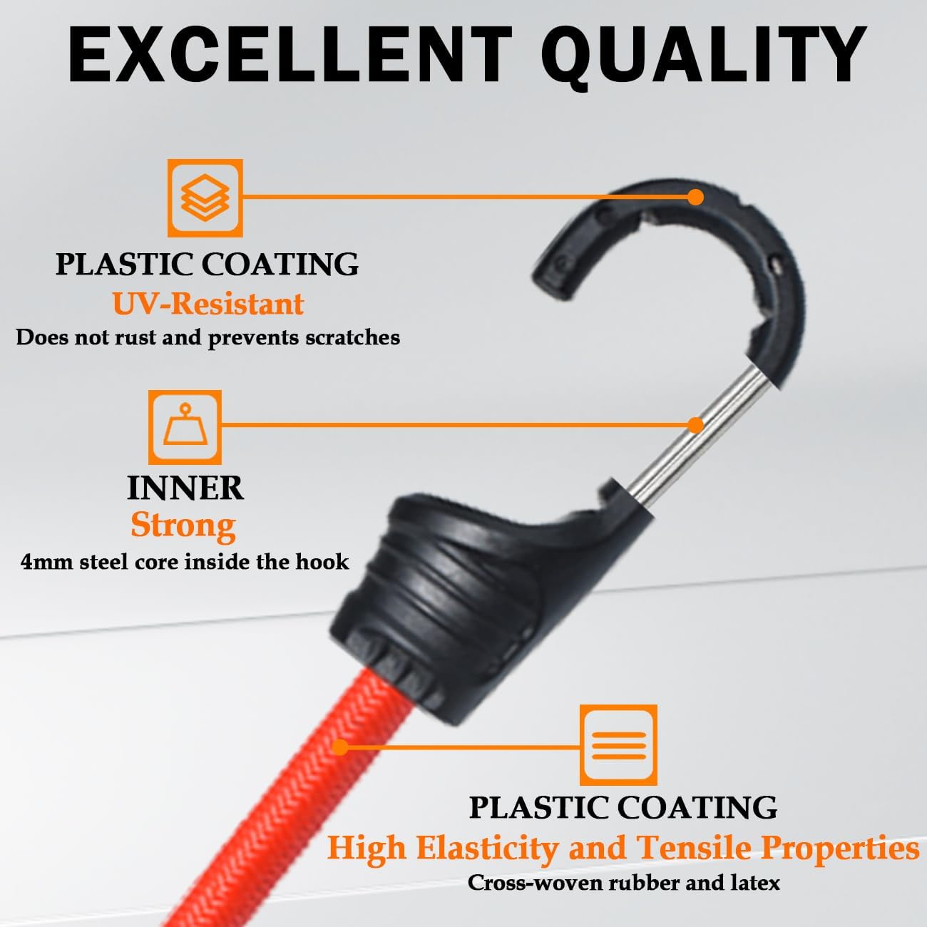 Diamètre de la corde : 8 mm. Large application : ces tendeurs sont suffisants pour une utilisation quotidienne, tels que le stockage de bagages, la suspension de paniers de fleurs, le stockage de matériel de fitness, la construction de bâches de camping, etc. Tendeurs élastiques Avec Crochets - 8 Pièces (4x45cm Chaque corde est équipée d'un crochet métallique à bout arrondi, qui évite les rayures sur vos objets (vélos, bagages, meubles) et garantit une fixation... Facile à utiliser : pas besoin de dépenser trop d'énergie pour vous aider à réparer de grands bagages et articles sur le vélo, ce qui aide à augmenter la capacité et est un choix idéal pour le cyclisme ou les voyages. MARRTEUM Lot De 4 Tendeurs Rouges Avec Crochets Pour Camping, Vélo, Chariot Pliant, Coffre, Etc. 4 Crochets En Acier Recouvert De Plastique Contenu : 4 tendeurs élastiques de 45,7 cm de long avec crochets Crochets en acier recouvert de plastique : il y a des crochets en acier robustes aux deux extrémités de la corde élastique, enveloppés de plastique, ce qui peut éviter de rayer vos articles, pas facile à casser et facilement accrochés au point d'ancrage. Matériau : les cordes élastiques solides sont fabriquées en latex de haute qualité mélangé avec du caoutchouc, recouvert de fil de nylon tissé, pour garantir une bonne performance d'extension et une résistance aux UV pour une longue durée de vie. HUIXI- Tendeurs Elastique Plat avec Crochets 2M4 piece Sandow Reglable...